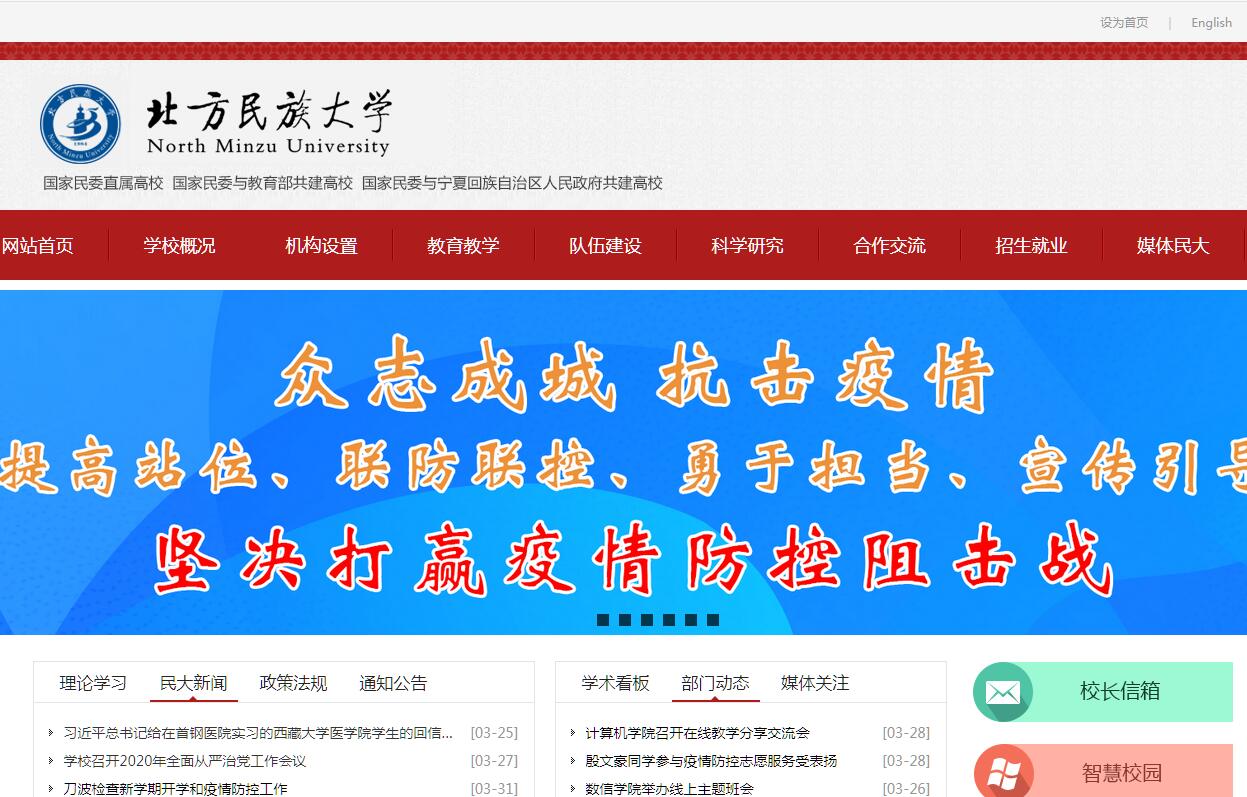 北方民族大学直属于国家民族事务委员会,是一所综合性民族类普通高等院校。学校坐落在“塞上江南”——宁夏回族自治区首府银川市,是我国唯一一所建立在少数民族自治区的部委高校。学校前身为西北第二民族学院,始建于1984年,2008年更名为北方民族大学。学校为国务院学位办批准的学士、硕士、博士学位授予权单位。学校坚持中国特色社会主义大学“四个服务”的办学方向,全面贯彻党的教育方针,遵循高等教育规律,尊重民族高等教育特点,坚持为少数民族和民族地区服务、为国家发展战略服务的办学宗旨。学校是培养少数民族优秀人才的重要基地,是研究民族理论与民族政策的重要基地,是传承和弘扬民族优秀文化的重要基地,也是展示我国民族政策和对外交流的重要窗口。学校现有来自全国31个省、市、自治区的56个民族的硕士生、本科生、预科生2.1万余人,少数民族学生比例为60%,是中华民族大家庭的缩影。30多年来,学校为少数民族和民族地区经济社会发展培养了5万余名优秀人才,他们深谙民族文化传统,熟悉民族风俗民情,在民族地区安心工作,已经成为各民族“共同团结奋斗,共同繁荣发展”的践行者,少数民族和民族地区经济社会发展的建设者,民族优秀文化的弘扬和传播者,民族团结、祖国统一的捍卫者。学校高度重视学科专业建设,现有文学、理学、工学、法学、历史学、管理学、经济学、艺术学、教育学、医学10个学科门类的72个本科专业;民族学等10个一级学科硕士学位点; MPA等9个专业硕士学位点;民族学为一级学科博士学位授权点;中国少数民族史等16个省部级重点学科;材料科学与工程等4个国家级特色专业;汉语言文学等9个省部级优势特色专业;法学等4个省部级重点建设专业;自动化等7个省部级“十三五”重点建设专业(群); 材料科学为国家级实验教学示范中心,化工技术基础等8个省部级实验教学示范中心。学校实施“人才强校”战略,坚持培养和引进并重,建设了一支质量较高、结构合理的专业人才队伍。现有教职工1332人,其中具有高级专业技术职务人员537人;国家“万人计划”哲学社会科学领军人才1人,国家“万人计划”科技创新领军人才1人,“百千万人才工程”国家级人选3人,文化名家暨“四个一批”人才工程1人,享受国务院政府特殊津贴7人,全国“百千万知识产权人才工程”百名高层次人才1人,全国优秀教师1人,教育部“新世纪人才支持计划”2人,科技部中青年科技创新领军人才1人,国家民委突出贡献专家4人,享受自治区政府特殊津贴4人。学校在培养少数民族优秀人才的同时,积极面向民族地区经济社会发展开展科学研究,加强与地方政府的交流与合作,建立了依托地方、融入地方、服务地方的合作办学、合作攻关联合机制,加大校地校企合作步伐,在社会服务中实现大学使命和价值回归。近五年来,学校承担省级以上科研项目546项,在粉体材料与特种陶瓷研究、工业废弃物循环再利用、葡萄种植与葡萄酒酿造技术、北方语言研究、生态移民及精准扶贫等方面形成了一定的特色和优势。学校建设了发酵酿造工程生物技术重点开放实验室等6个省部级重点实验室、1个国家和地方联合工程研究中心、1个示范型国家国际科技合作基地、1个全国科普教育基地、3个国家民委人文社科研究基地、 1个自治区级技术创新中心、3个自治区高等学校科技创新平台。学校坚持开放办学,积极开展对外合作交流。合肥工业大学为国家民委和教育部指定的对口支援高校;同时,学校还与北京大学、西安交通大学、北京科技大学、兰州大学等多所国内高校、科研机构、地方政府、行业 企业开展交流合作并保持着良好的合作关系。学校主动服务“一带一路”倡议,大力推进教育对外开放,于2014年成立了国际教育学院,2015年加入丝绸之路大学联盟,2017年获批3个教育部国别和区域研究中心。通过举办中亚国家青年汉语培训班、宁夏国际友城青年汉语培训班,招收和培养汉语进修、学历教育、项目培训留学生。加强国际教育,目前有国际留学生82人;学校先后与美国、法国、马来西亚等28个国家和地区的60多所高校、机构签署了合作协议。学校积极开展“双创”教育,实施“双驱动”+“双三位一体”的创新创业教育模式,建立以资源共享、兴趣驱动、学科交叉、尊重个性、自主学习、自我管理为支撑的“创新创业团队+创新创业实践+校企合作实践”三位一体实践平台,有力促进了“创新引领创业,创业带动就业”。学校被评为首批“宁夏回族自治区创业孵化示范基地”“宁夏回族自治区科技企业孵化器”,被教育部授予“全国首批百所深化创新创业教育改革示范高校”,被人力资源和社会保障部评为第三批“全国创业孵化示范基地”,被团中央授予“全国大学生创业示范园”称号。创新创业人才培养模式改革获得自治区教学改革成果特等奖。 30多年来,伴随着我国改革开放的步伐,学校事业高速发展。2000年学校顺利通过教育部本科教学合格评估,2004年国家民委与宁夏回族自治区签署共建协议决定共建北方民族大学,2007年在教育部本科教学工作水平评估中获得优秀。2011年被教育部授予全国高校毕业生就业工作50强经验推广高校。2015年国家民委和教育部决定共建北方民族大学在内的6所委属高校,学校发展迎来新的契机。2018年获批成为博士