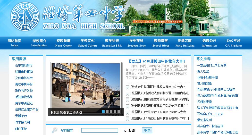 山东省淄博第四中学座落在“世界短篇小说之王”蒲松龄的故乡--淄川,是一所具有深厚精神传统和文化底蕴的名牌老校,前身为始建于1929年(民国18年)的淄川县立初级中学,1952年山东省人民政府在原淄川县立初级中学旧址建立了山东省立淄川中学,1953年山东省博山三中并入,1955年更名为山东省淄博第四中学,1980年被定为市属重点中学,1993年被省教委确定为“省级规范化学校”。2003年经市政府协调成功置换原淄博师范校区,现有两个校区,占地面积175亩。建有校园网、电视台、闭路电视系统、有线广播系统和电子监控系统,实现了教育教学管理的信息化、现代化;建有探究实验室、数字星球实验室、机器人实验室、天文台等,为学生探索科学奥妙、发展创新思维提供了优质的平台;图书馆藏书10余万册、订有200余种报刊,为广大师生提供了丰富的精神食粮;学生公寓、餐厅均达到标准化要求。美丽优雅的校园环境、设施完备的教学条件为师生提供了温馨惬意的工作、学习和生活环境。坚持以提高教育教学质量为中心,全面推进素质教育和新课程改革,保证了学生整体素质的全面提升,教育教学成绩一直名列全市前列;不断拓展国际视野,先后与美国、加拿大、澳大利亚、日本、韩国、新加坡等教育团体和机构建立了友好合作关系。2013年起成立国际部,美国“1+3”名校直录奖学金项目连续六年成功运作;2018年淄博育才科林剑桥国际学校正式揭牌,举办首届“剑桥A-level课程”班、首届中英“国际预科班”。目前,学校在开足开全国家课程之外,开设了校本课程80余门,拥有学生社团50余个,保障了学生的个性成长;每年上半年举行诗歌节暨大型诗歌朗诵会,下半年举行校园文化艺术节,囊括各类文体活动,丰富多彩,异彩纷呈,使师生尽享素质教育的幸福。学校以“培养有爱国情怀、有国际视野、有社会责任感、有创新意识、有君子风范的现代公民”为培养目标,以“以人为本,文化立校,培育个体发展,延续民族生命”为办学宗旨,形成了人本化管理与精细化管理相结合的学校管理模式;坚持以文化建设统领学校发展,形成了“文明、进步、多元、和谐”的学校文化特色;坚持以“爱”与“理解”为主题的教师文化建设,鼓励教师“立德、立身、立功、立言”,形成了“创新、合作、学习、智慧”为核心的教师文化生态;重视学生的人生规划与自我发展的能力的培养,积极营造“敬、诚、静、勤、恒、实”的学风,打造了以“自主”与“参与”为核心的“自主型学生文化”。2017年,学校评为山东省首届“省级文明校园”,先后被授予“全国五四红旗团委”、全国首批“国防教育特色学校”、“全国青少年足球特色学校”、“全国NOC信息化教育实验学校”、 全国及省“平安和谐校园建设先进单位”“省教育系统先进集体”“省教学示范校”“省艺术教育示范校”“省级文明单位”“省职业道德建设先进单位”“省教育系统行风建设先进集体”“省依法治校示范校”“省级绿色学校”“省诗意校园”“市‘十五’期间普通高中名校”“市文化名校”“振兴淄博劳动奖状”“市第二届、第四届师德建设先进单位”“市红十字模范校”“全国化学新课程实验先进学校”等荣誉称号,现为山东创新教育研究院高中联盟副理事长单位、全国中学教育科研联合体理事单位、全国中小学德育科研联合体理事单位,中国教育学会“一线教育家讲坛”理事单位、中国西部教育顾问单位,成为鲁中地区颇有影响的一所名校。迎着素质教育的大潮,淄博四中人正以崭新的面貌,激情昂扬,勇立潮头,以建设“特色学校、精品学校、齐鲁名校”为目标,向着新的征途高歌猛进!