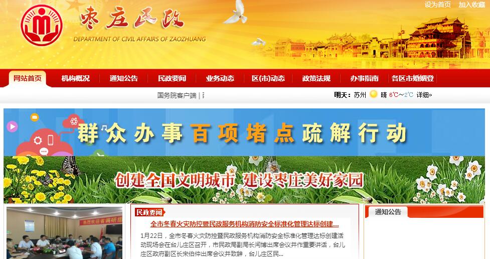 枣庄市民政局主要职责:一、起草全市民政工作政策和规范性文件,拟订全市民政事业发展规划和年度工作计划,并组织实施和监督检查。二 、会同有关部门拟订全市社会工作发展规划、政策,推进社会工作人才队伍建设和相关志愿者队伍建设。三、管理国家、省和市拨民政事业经费,指导、监督民政事业经费的使用。四、承担依法对社会团体、民办非企业单位进行登记管理和监察责任;指导全市社会组织的党建工作。五、负责全市优抚对象的抚恤、补助、优待和国家机关工作人员伤亡抚恤工作;承担烈士褒扬工作;负责有关人员伤残等级的审核、报批、调整工作;指导优抚事业单位和烈士纪念建筑物的管理工作;组织指导全市拥军优属工作;承担市拥军优属拥政爱民工作领导小组的日常工作。六、负责全市退役士兵、复员干部、移交地方政府安置的军队离退休干部和军队无军籍退休退职职工接收安置工作;指导全市军队离退休干部休养所建设和管理工作;指导军供工作;指导全市退役士兵的技能培训工作;承担政府安置的军队离退休干部调整离退休费和护理费审批事项。七、拟订全市救灾工作政策;组织、协调全市救灾工作;组织自然灾害救助应急体系建设;负责组织核查并统一发布灾情;管理、分配救灾款物并监督使用;组织、指导救灾捐赠,负责市级并指导县市区救灾物资储备工作;拟订全市减灾规划,承担市减灾委员会的日常工作。八、牵头拟订全市社会救助规划、政策和标准,负责城乡居民最低生活保障、医疗救助、临时救助、生活无着人员救助工作;推进城乡社会救助体系建设。九、拟订全市城乡基层群众自治组织建设和社区建设政策;指导城乡社区服务体系建设;提出加强和改进基层政权建设的建议;推动基层民主政治建设。十、拟订全市行政区划总体规划并组织实施;负责县(市、区)、乡(镇)行政区域的设立、命名、变更和政府驻地迁移的审核、报批工作;负责市内县级行政区域界线的勘定和管理工作;承担市际及县际行政区域边界争议的调查和调处工作;负责全市地名管理工作。十一、拟订全市社会福利事业发展规划、政策;指导全市社会福利机构建设;指导、管理福利彩票发行工作;拟订促进慈善事业的政策;组织、指导社会捐助工作;指导老年人、孤儿和残疾人等特殊群体权益保障工作。十二、推进婚俗和殡葬改革;指导全市婚姻登记工作;承办涉外、涉港澳台居民、华侨婚姻登记工作;承办涉港澳台居民和华侨儿童收养登记工作;承担全市经营性公墓的审报工作;指导全市婚姻、殡葬、收养、救助服务机构管理工作。十三、负责民政信访工作。十四、承办市委、市政府交办的其他事项。