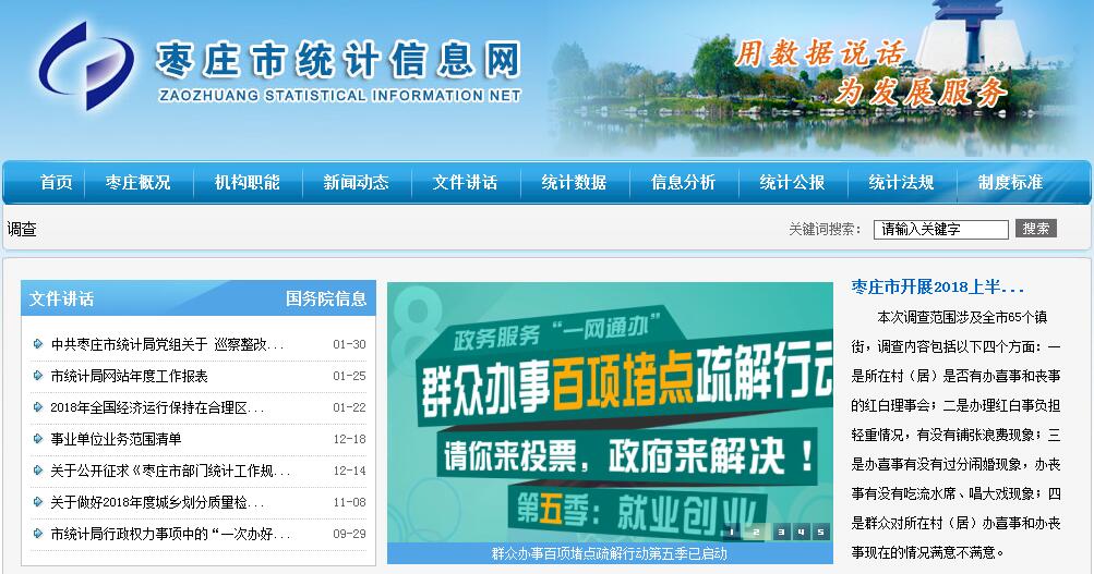 枣庄市统计局是全市社会经济信息的主体部门和国民经济核算的中心,是强有力的统计监督机构和重要的咨询机构。是市政府主管全市统计和国民经济核算工作的职能部门。主要职责是:(一)贯彻执行国家、省有关统计工作的法律、法规、政策和计划,研究制定我市统计工作的规定、统计现代化建设规划和统计调查计划。组织领导和综合协调各区县、各部门的统计和国民经济核算工作,监督检查统计法律、法规的实施。(二)根据宏观管理和科学决策的需要,建立健全全市国民经济核算体系和统计指标体系,贯彻全国统一的基本统计报表制度,制定或与有关部门共同制定全市统计标准,审定部门统计标准。(三)按照国务院实行周期性普查制度的规定,在市政府的统一领导下,具体组织实施各项重大的国情国力的普查。组织协调全市城市和农村社会经济等抽样调查。(四)搜集、整理、提供全市性的基本统计资料,并对国民经济和社会发展的基本情况和科技进步情况进行统计分析、统计预测和统计监督,提供统计服务,向市委、市政府及市有关部门提供咨询服务。(五)检查、审定、管理、公布、出版全市的基本统计资料,定期发布全市国民经济和社会发展的统计公报。(六)审查本市各部门的统计调查计划及其实施方案,管理本市各部门制发的统计调查表。(七)受省统计局委托管理省统计局设在我市的直属调查机构,管理省统计局下拨的各项统计事业费。协助区(市)管理区(市)统计局局长、副局长。(八)组织指导全市各部门、各单位加强统计基础工作建设,健全统计信息网络;负责统计教育、统计干部培训及统计科学研究工作。(九)完成市委、市政府交办的工作任务。