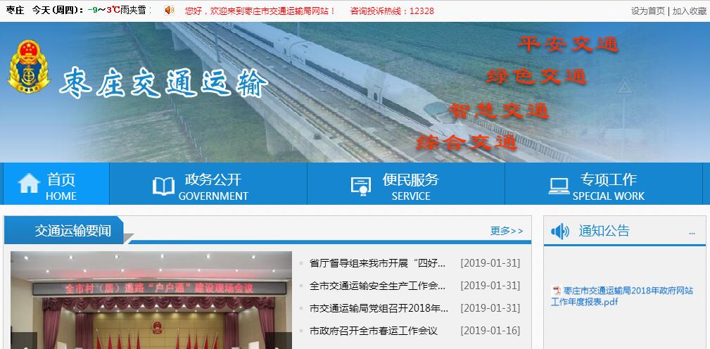 根据中共山东省委、山东省人民政府批准的《枣庄市人民政府机构改革方案》(鲁厅字〔2009〕58号)和《中共枣庄市委枣庄市人民政府关于枣庄市人民政府机构改革的实施意见》(枣发〔2010〕1号),设立枣庄市交通运输局,为市政府工作部门。其主要职责:(一)贯彻执行国家、省、市有关交通运输工作的法律、法规和政策;起草交通运输行业的规范性文件,经批准后组织实施;负责交通运输(公路、港航、地方铁路、道路运输、城市客运等)管理。(二)承担涉及综合运输体系的规划协调工作,会同有关部门组织编制综合运输体系规划,指导协调交通运输枢纽规划和管理。(三)拟订全市交通运输行业发展规划、计划,贯彻执行上级部门颁布的行业政策、标准并监督实施;参与拟订现代物流业发展战略和规划;指导交通运输行业有关体制改革工作。(四)承担道路、水路运输市场监管责任;指导并监督道路、水路运输有关政策、准入制度、运营规范、技术标准的实施;指导城乡客运及有关设施的规划、管理工作;按规定组织协调重点物资和紧急客货运输;指导道路、水路运输服务行业管理工作。(五)承担水上交通安全监管责任;负责市辖内河水上交通管制、救助打捞、危险品运输监督管理工作;负责船舶(不含渔业船舶)及相关水上设施检验、登记、防止污染工作;指导港口设施保安、引航管理工作。(六)负责提出公路、水路固定资产投资规模和方向、政府财政性资金安排建议;贯彻执行公路、水路有关规费政策并监督实施,提出有关财政、土地、价格等政策建议;负责公路通行费收费、内河船闸、超限超载检测站点设置的审核、申报工作;指导行业投融资工作。(七)承担公路、水路、地方铁路建设市场监管责任;贯彻执行上级公路、水路、地方铁路工程建设相关政策、制度、技术标准并监督实施;组织协调公路、水路、地方铁路有关重点工程建设和工程质量、安全生产及造价的监督管理工作,指导交通运输基础设施管理和维护;指导港口规划和岸线使用管理工作。(八)承担全市高速公路统一管理责任;负责全市国道、省道的布局规划和建设、养护、管理;监督和指导农村公路的规划、建设、养护、管理工作;负责辖区内的铁路专用线的行业管理以及铁路专用线共用的协调管理。(九)贯彻实施国家和省交通科技政策、技术标准和规范,组织行业科技开发;指导公路、水路、地方铁路环境保护和节能减排工作;指导行业教育、培训工作;负责相关行业统计,发布有关信息。(十)指导交通运输方面的合作与交流工作;负责相关涉外运输的管理工作。(十一)指导交通运输行业安全生产和应急管理工作;负责全市交通战备工作,承办市国防动员委员会的有关工作。(十二)承办市委、市政府交办的其他事项。