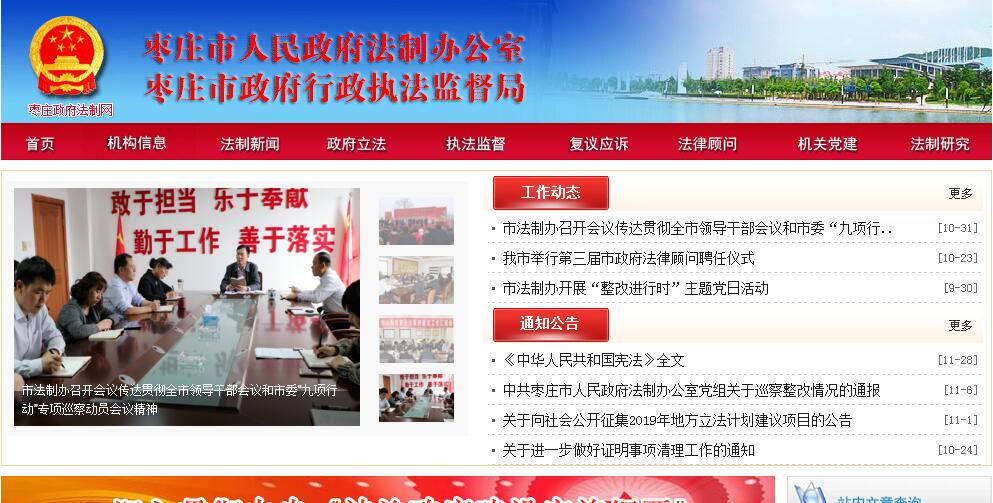 枣庄市人民政府法制办公室主要职责:(一)贯彻执行国家和省关于政府法制建设的方针、政策和法律、法规、规章;调查研究依法行政和政府法制建设中出现的新情况、新问题,提出推进依法行政的具体措施和工作建议;承担市政府推进依法行政的日常工作,负责全市依法行政的综合规划、指导协调、督促检查和政策研究。(二)承担市政府重大决策、重大协议、重大合同等涉法性事务合法性论证及审查工作。(三)承担统筹规划市政府立法工作,拟订市政府年度立法计划;承担地方性法规草案、政府规章草案审查工作;负责地方性法规草案、市政府规章草案向社会公开征求意见;承办市政府规章的立法解释工作;承办市政府规范性文件合法性审查工作;承办区(市)政府、市政府部门制定的规范性文件备案审查工作。(四)负责对行政执法机关行政执法行为的监督检查;协调部门之间在法律、法规、规章实施中的矛盾和争议;负责组织全市行政执法人员的教育培训和资格管理工作;承担推进相对集中行政许可权工作,负责并指导有关部门推进相对集中行政处罚权工作。(五)负责依法行政评议考核工作;负责推行行政执法责任制,承办行政执法错案责任追究事项。(六)负责组织实施相对集中行政复议权工作,承担市政府行政复议委员会的日常工作;指导、监督各区(市)政府、市政府各部门行政复议和行政诉讼工作;承办由市政府作为赔偿义务机关的行政赔偿事务;受市政府委托代理行政应诉和其他诉讼案件。 (七)负责依法行政和政府法制的信息公开、宣传和新闻发布工作;承担市政府领导集体学法的具体工作。(八)承担市政府及其部门的法律咨询和服务工作;负责市政府法律顾问的聘任、组织、协调等日常工作。(九)承办市委、市政府交办的其他工作。