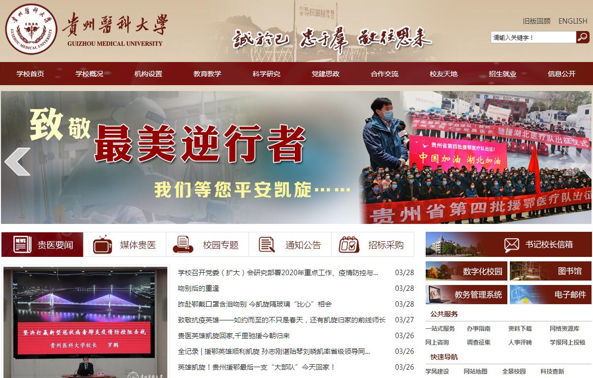 贵州医科大学地处祖国西南的避暑之都——林城贵阳。其前身为创建于1938年的国立贵阳医学院,是当时隶属于教育部的九所国立医学院校之一。1950年更名为贵阳医学院,2015年更名为贵州医科大学,是贵州省唯一拥有医学学士——硕士——博士完整人才培养体系的省属重点高校。1938年3月,为谋战时急切之需,立西南之医学基础,在首任院长、我国早期热带病学专家、医学教育家李宗恩博士的带领下,杨崇瑞、朱章赓、汤佩松、贾魁、杨济时、刘维德、洪谦、林绍文、侯宝璋、张孝骞、郭秉宽、王季午、朱懋根、李瑞麟、李漪、王志均等大批文学、医学先驱云集贵医,在室如悬磬的环境中,国立贵阳医学院应运而生,开创了贵州高等医学教育之先河。经过七十多年的砥砺前行,学校现有南、北两个校区,占地面积1868亩,在校全日制学生19097人,其中研究生1862人。教学科研仪器设备总值3.09亿元,图书馆藏书174.54万册,电子图书43万册。设有20个教学单位,30个本科专业,涵盖医学、理学、工学、教育学、文学、法学、管理学等七大学科门类。在职职工1417人,专任教师1067人,其中具有博士学位259人,正高职称235人、副高417人。拥有教育部“长江学者”讲座教授1人,有国家“ 杰出专业技术人才”2人、“百千万人才工程国家级人选”一二层次专家3人、国家“卫计委有突出贡献中青年专家4人、教育部“新世纪优秀人才支持计划”入选者4人、教育部专业教学指导委员会委员3人、全国优秀科技工作者4人、中国青年科技奖1人、全国“五一”劳动奖章获得者3人、全国模范教师2人、全国优秀教师3人、贵州省“十百千人才计划”十层次人才1人、“贵州省百人领军人才”3人、贵州省核心专家6人、贵州省省管专家22人、“国务院特殊津贴”获得者24人、“省政府特殊津贴”获得者23人、二级教授18人。有国家级教学团队1个,教育部“长江学者和创新团队发展计划”1个,此外,学校柔性引进国内外知名专家学者、院士、诺奖得主24人担任客座教授。学校拥有省级重点学科9个、省级特色重点学科4个、国家卫计委临床重点建设专科4个,博士后科研流动站1个、一级学科博士学位授权点1个、二级学科博士学位授权点10个、一级学科硕士学位授权点6个、二级学科硕士学位授权点47个、专业硕士学位授权点5个。有国家级实验教学示范中心2个,省级实验教学示范中心7个;拥有国家和省部级科研平台22个,各级科研创新团队20个,其中,国家工程技术研究中心(共建)1个、国家地方联合工程实验室(工程研究中心)2个、教育部重点实验室(中心)3个、省级重点实验室(中心、基地)3个,是国家农药登记毒理学试验单位和国家级药物临床实验机构。2011-2015年,获国家级、省部级科研成果奖34项,其中国家科技进步二等奖1项,贵州省科技进步一等奖3项、二等奖9项;承担各级各类科研项目1613项,其中国家自然科学基金重点项目、国家科技支撑计划、科技部重大专项、科技部国际科技合作项目、国家自然科学基金等国家级科研项目170项;发表学术论文3490篇。学校发挥医、教、研优势,积极服务社会。在地方病研究、中药民族药研发、组织工程干细胞生物医药研究、病原生物学研究、科研成果转化等领域,成绩突出,成果斐然。建立了省内最大的医疗服务体系,有直属附属医院9所(3所在建),非直属附属医院10所,教学医院11所。与贵阳市签订了全面合作协议,与信邦集团、益佰制药、威门制药等企业开展合作,一大批科研成果得到转化应用。建校以来已累计培养5万余名毕业生,其中研究生5000余名;2011-2015年,接受基层医疗卫生人员各类培训项目,累计培训138415人次,其中通过转岗培训和岗位培训,培养了合格的全科医生4734名。学校高度重视对外交流与合作,是苏州大学对口帮扶高校,与美、英、日、韩及台湾等30多个国家和地区的高水平大学及科研机构建立了合作办学及科研合作关系;是科技部国际科技合作基地,建立了中美、中英联合实验室。2008年以来,学校协办了东盟教育周医学教育论坛、中国科协联会中美临床转化医学论坛。2013年启动留学生教育。2015年,学校成功更名为贵州医科大学,贵医人主动而为,顺利整合贵州省中国科学院天然产物化学重点实验室,服务贵州“大健康”战略成立大健康学院,综合实力得到了进一步增强。学校发展步入了新的起点,开始了新的征程。面向未来,贵州医科大学始终秉承“诚於己、忠于群、敬往思来”的校训,奉行“大医精诚”的精神,坚持“文化建校、质量立校、人才强校、科研兴校”的办学理念,努力建设“具有明显特色、西部一流、在国内外有影响力的高水平医科大学”。