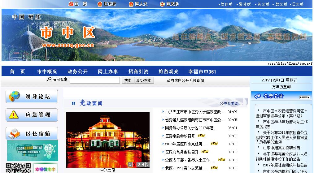 | 网站简介: 市中区隶属于山东省枣庄市,位于枣庄市中部偏东,北靠山亭区,东连兰陵县,西与薛城区接壤,南同峄城区毗邻。地理坐标为:东经117°27′34″-117°45′18″,北纬34°46′16″-34°57′59″。市中区辖6个街道、5个镇,总面积375.27平方公里,总人口55.96万人(2016年)。2016年,初步统计市中区生产总值完成226亿元,地方财政收入完成22.2亿元,固定资产投资完成213亿元,社会消费品零售总额完成141亿元,分别是2011年的1.37倍、1.72倍、1.93倍、1.63倍。市中区有2家国家AAAA级旅游景区,景点主要有仙坛山温泉小镇、东湖公园、龟山旅游风景区、甘泉寺、鲁南观赏石馆等。 |