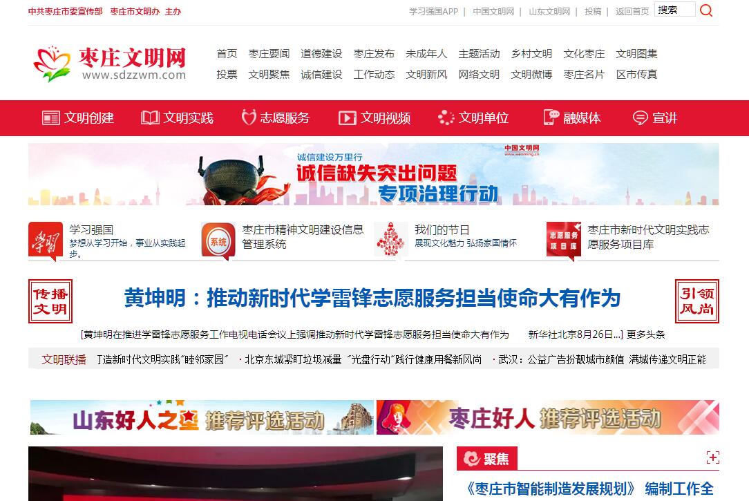 | 网站简介: 枣庄精神文明网网站(简称“枣庄文明网”)是中共枣庄市委宣传部、枣庄市文明办的门户网站, 是枣庄市宣传思想文化工作和精神文明建设的重要窗口。网站主要发布宣传思想文化和精神文明建设重要信息,进行理论宣传和形势政策教育,开展思想道德建设和精神文明创建活动,传播文明、引领风尚,促进社会文明水平和公民文明素质的提高。枣庄文明网建设目标是成为推动宣传思想工作和精神文明建设的工作平台,传播文明、引领风尚的重要阵地,文明办网、建设中国特色网络文化的示范窗口。 |