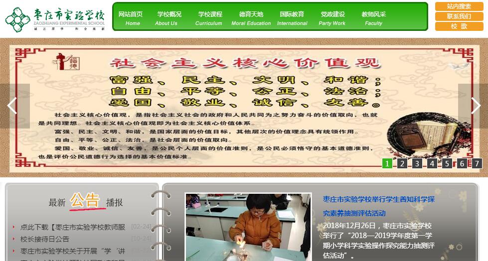 山东省枣庄市实验学校是在枣庄市委、市政府的关心下,在枣庄市行政中心西迁的背景中,为完善枣庄新城区的城市教育配套功能而兴建的一所国办九年一贯制义务教育学校,于2008年9月1日竣工并投入使用。学校占地142亩,位于枣庄新城武夷山路西侧、海河路北侧、井冈山路东侧,设计规模为66个教学班。实验学校秉持“诚正厚学·和合致新”的办学理念与“养厚·力新”的校训,以校本文化建设为抓手,在“教养善知”校本教育思想的引领下,师生在教学生活中大胆实践、勇于创新、发挥特长,以“实验”为特色,推动教学体制、教材教法等改革试验,建设校本善知课程系统,创设了必修课程和选修课程并行的课程体系,打造善知教育品牌。学校注重校本培训与校本教研,在枣庄市乃至山东省的课程改革中起到了示范作用。经过多年的努力和探索,学校确立了“善知共生”的教育目标。2015年,学校被授予“南京大学Ed.D& Ed.M(教育博士和教育硕士)实践基地”,同时,孙飞校长被南京大学聘任为教育硕士兼职导师。实验学校重视教职工队伍建设,为教师的职业发展创造有利条件,为学生创造优质成长环境,为社区提供有效教育平台,学校现有特级教师2人,省级名师28人,市级名师43人,硕士研究生33人,本科以上学历教师100%,正在进行和已经完成研究生课程班学习及研究生学历学习的教师达到23.9%,已初步形成教学水平较高、责任心较强、师德高尚的科研型、创新型教师队伍。实验学校已与韩国高唱北中、澳大利亚泰尼森伍兹学院、圣方济学校等数所国外和境外学校建立了广泛而密切的联系,师生间的互访交流、教育教学研讨活动的开展,不但加深了相互间的了解,更拓宽了师生的视野。学校每年接待外国教育代表团来校参观交流约320人,同时每年还接待了来自全国各地的校长、教师代表团约900人次。随着对外交流与合作的领域迅速拓展,学校的国际影响和知名度不断增强,学校的办学效益得到了社会广泛的肯定赞扬,学校工作得到了上级部门的肯定,学校已成为一所在国内外有一定影响的实验性、示范性齐鲁特色名校。