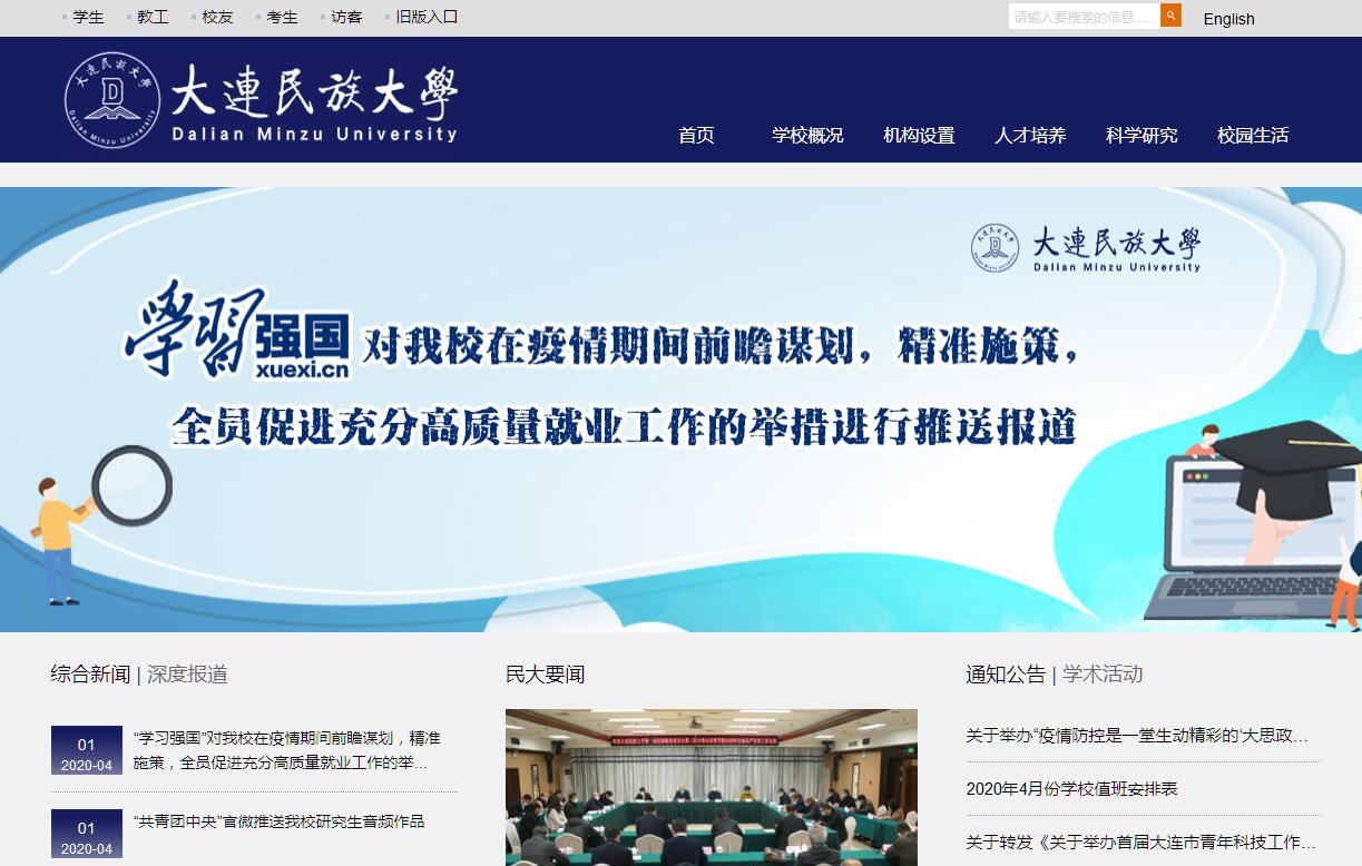 大连民族大学位于辽宁省大连市,隶属于国家民族事务委员会,是国家唯一设在东北和沿海开放地区、以工科为主多学科协调发展的综合性民族高等学校。学校1984年立项筹建,2006年实现国家民委、辽宁省政府和大连市政府三方联合共建,2015年实现国家民委、教育部共建。学校有开发区和金石滩两个校区,设有经济管理学院、机电工程学院、生命科学学院、外国语学院、计算机科学与工程学院、设计学院、土木工程学院、文法学院、理学院、预科教育学院、国际商学院、信息与通信工程学院、环境与资源学院、物理与材料工程学院、建筑学院、工程教育学院、思想政治理论课教学科研部、国际文化交流学院、东北少数民族研究院、体育教学研究部等20个教学科研单位,本科专业52个,涵盖工、理、经、管、文、法、艺七大学科门类。学校面向全国31个省区市及港澳台地区招生,56个民族学生齐聚校园,少数民族学生占60%以上,来自少数民族、民族地区和西部地区的学生占80%以上。学校现有教职工1264人,其中专任教师834人,有博士学位的教师占50.00%,有硕士以上学位的教师占88.73%,副教授以上职称的教师占50.84%,双师型教师占21.34%。教师中拥有国家“万人计划”领军人才、科技部中青年科技创新领军人才、国务院特殊津贴专家、中科院“百人计划”、教育部“新世纪优秀人才计划”等优秀人才140人次。学校以建设特色鲜明的高水平现代化民族大学为目标,坚持为少数民族和民族地区服务的办学宗旨,坚持实施质量立校、科技兴校、人才强校和国际化发展战略,在教学科研、学科建设、师资队伍、人才培养等方面形成了后发优势,凝练了“立足沿海、服务民族,应用为主、教育创新,质量立校、因材施教,团结和谐、全面发展”的办学特色,比较成功地探索出了一条在沿海开放地区发展优质民族高等教育的创新之路。学校建成国家级特色专业建设点8个,拥有省部级重点学科9个,省部级工程技术研究中心2个,省部级重点实验室7个,省部级重点人文研究基地3个,同时获批国家民委创新型专业学位研究生培养基地。学校始终坚持教学工作的中心地位,不断深化教学改革和各项教学基本建设。学校获国家科技进步奖二等奖2项,国家级教学成果二等奖2项,全国教育科学研究优秀成果三等奖1项,辽宁省教学成果一等奖6项,二等奖12项。2006年,学校被评为全国首批大学英语教学改革示范学校,2007年在教育部教学工作水平评估中获得优秀。2010年被批准为国家教育体制改革试点学校。学校建成国家级双语教学示范课程1门,辽宁省精品(资源共享)课程19门。2012-2016年度辽宁省本科专业综合评价中,学校工业设计、网络工程、新闻学、光电信息科学与工程等4个专业全省排名第一。工业设计、网络工程、日语专业获首批辽宁省普通高等学校本科优势特色专业。学校的本科创新教育、双语教学、课程教学国际化等特色得到了社会的广泛认可。建校以来,学校培养本科毕业生4万多人,就业率连续18年保持在90%以上。2010年,学校被教育部授予全国首批50所毕业生就业典型经验高校之一,是全国民族院校和大连市高校中首个获此殊荣的院校。近年来,学校还获得全国大学生志愿服务西部示范学校、辽宁省普通高等学校毕业生就业工作先进集体、国家民委就业典型学校、辽宁省大学生创业教育示范学校等荣誉称号。2009年、2014年,学校先后两次被国务院授予“全国民族团结进步模范集体”荣誉称号。2015年,被命名为“全国民族团结进步创建活动示范高校”。在新时代,学校将深入学习宣传贯彻习近平新时代中国特色社会主义思想和党的十九大精神,全面加强党的领导,牢牢把握社会主义办学方向,深入贯彻党的教育方针和民族政策,落实立德树人根本任务,突出学科建设,突出高质量发展,突出服务国家战略,不断开创学校事业发展新局面,为我国民族高等教育谱写更加绚丽多彩的新篇章。