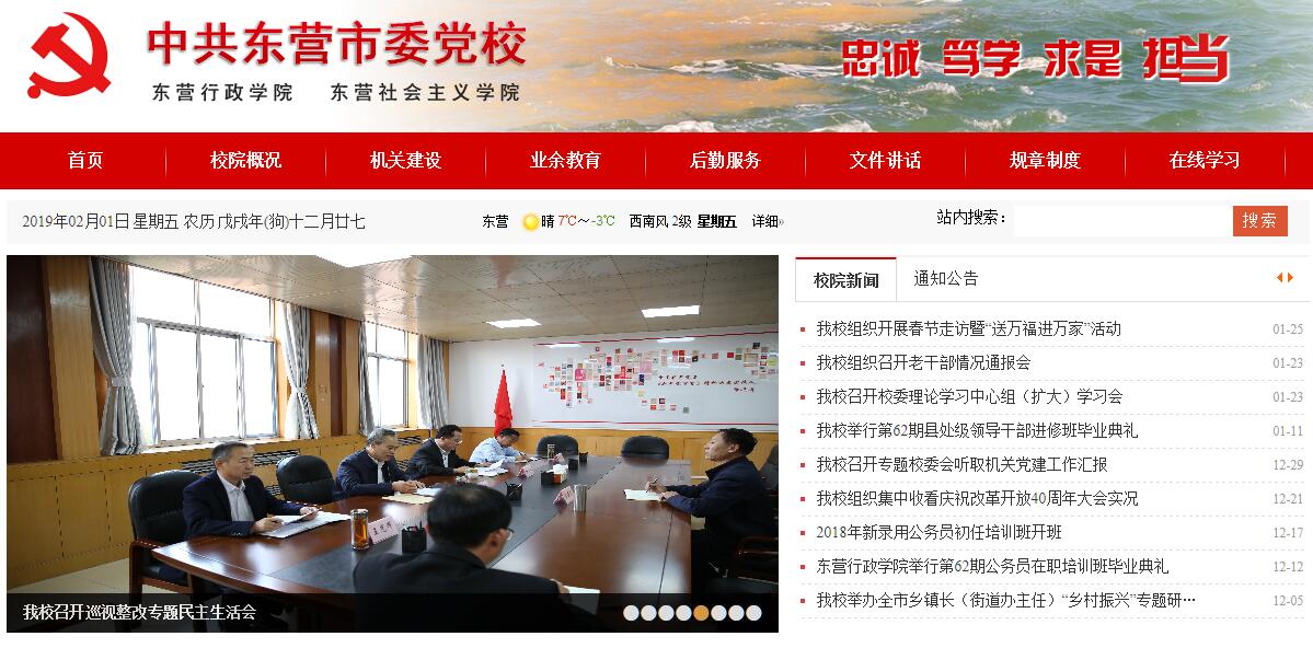 中共东营市委党校始建于1985年10月,与胜利油田党校合署办学,1991年3月与油田党校分设,借助东营电大开始独立办学,1993年10月迁驻现址,同年12月被批准为大学专科体制。1996 年11月加挂东营行政学院牌子,2008年6月加挂东营社会主义学院牌子。2005年1月改为校务委员会领导体制。全校现有在编职工90人,其中参公人员34人、专业技术人员43人、工勤人员13人。专业技术人员在聘教授5人、副教授16人、副研究馆员2人,讲师18人。设有机关党委、工会以及办公室(党校工作处)、组织处、教务处、科研处、学员管理处(行政干部培训处)、行政处、干部业余教育处、政治理论教研室、党史党建教研室、经济学教研室、管理学教研室、法学教研室、哲学社会科学研究所等13个副处级机构和统战工作培训处、财务科、保卫科、图书馆、电教中心等5个直属科级机构。适应形势发展需要,理顺对外办学机制,成立社会办学领导小组,挂牌成立了市委党校东营经济技术开发区分校和东营港经济开发区分校。校园占地面积99.6亩,总建筑面积近2万平方米,能同时容纳400人食宿。图书馆藏书近3万册,全部实现计算机管理,引进了3种全文数据库;数字图书馆提供7×24小时网上信息服务。近年来,在市委的正确领导和上级党校的关心指导下,市委党校大力弘扬和践行“忠诚、笃学、求是、担当”的东营党校精神,研究确定了“一三三五五”的工作思路,即:紧紧围绕建设干部教育培训“一流党校”的总体目标,突出“教学、科研、咨政”三大主题,发挥“主阵地、大熔炉、思想库”三大作用,坚持实施“党性立校、质量强校、人才兴校、开放活校、从严治校”五大战略,强化“机关党建、精神文明、干部队伍、党风廉政、后勤服务”五大保障,科学谋划、扎实推进各项工作,实现了党校工作改革创新、科学发展,社会地位和影响力不断提升。先后被评为省级卫生先进单位、省级花园式单位、全省部门绿化先进单位、市级文明单位、市级庭院绿化先进单位;多次被省委党校授予全省党校系统教学工作组织奖、科研工作组织奖、信息化建设先进单位、后勤服务先进单位、业务指导先进单位、招生工作先进单位等多项荣誉称号;多次在各类综合及单项工作中受到市委、市政府的表彰奖励,荣获全市2013年度和2014年度综合考核一等奖;2015年被市委、市政府通报表扬;2014年被授予省级文明单位。