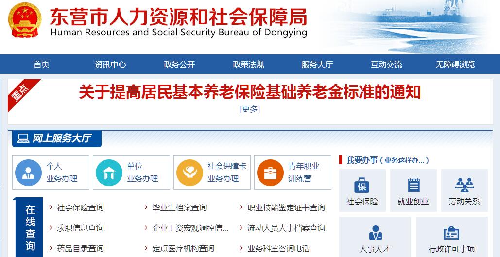 东营市人力资源和社会保障局主要职责:(一)贯彻落实国家、省人力资源社会保障法律、法规和规章;拟订全市人力资源社会保障事业发展规划、政策,并组织实施和监督检查。(二)负责落实人力资源流动政策,建立统一规范的人力资源市场,促进人力资源合理流动和有效配置。(三)负责促进就业工作。拟订统筹城乡就业发展规划和政策,健全公共就业服务体系;建立完善职业资格制度、就业援助制度和城乡劳动者职业培训制度;拟订全市技工学校及职业培训机构发展政策;牵头拟订高校毕业生就业政策;会同有关部门拟订高技能人才、农村实用人才培养和激励政策。(四)统筹建立覆盖城乡的社会保障体系。拟订城乡社会保险及其补充保险政策并组织实施;落实社会保险关系转续办法和基本养老保险省级统筹办法;拟订机关企事业单位基本养老保险规范性文件;会同有关部门拟订社会保险及其补充保险基金管理和监督制度;编报全市社会保险基金预决算建议草案;落实社会保险基金投资政策。(五)负责就业、失业、社会保险基金预测预警和信息引导;拟订应对预案,实施预防、调节和控制,保持就业形势稳定和社会保险基金总体收支平衡。(六)负责落实机关、事业单位人员工资收入分配政策,建立健全机关企事业单位人员工资正常增长和支付保障机制;负责落实机关企事业单位人员福利和离退休政策。(七)指导事业单位人事制度改革;拟订事业单位人员和机关工勤人员管理政策;拟订专业技术人员管理和继续教育政策;牵头推进深化职称制度改革工作;健全落实博士后管理制度;负责高层次专业技术人才选拔和培养工作。(八)综合管理全市引进国外智力、赴国(境)外培训和留学人员来我市工作。负责落实引进国外智力规划和政策,编报引进国外智力专项经费预算,并监督实施;负责全市出国(境)培训项目及人员的审核、备案和来我市工作外国专家的管理工作;组织实施重点出国(境)培训项目和聘请外国专家规划;会同有关部门拟订吸引国(境)外专家、留学人员来我市工作或定居政策;管理非教育系统公派留学工作;指导全市人力资源和社会保障方面的对外交流工作。(九)会同有关部门拟订军队转业干部安置政策和安置计划;负责军队转业干部培训工作;指导自主择业军队转业干部管理服务工作。(十)负责行政机关公务员综合管理工作;贯彻实施公务员管理的法律、法规、规章和政策,会同有关部门拟订相关配套政策并组织实施和监督检查;负责事业单位工作人员参照公务员法管理工作和聘用制公务员管理工作;会同有关部门组织落实国家荣誉制度,拟订政府奖励制度并组织实施;依法办理市政府提请市人大常委会决定任免工作人员手续和市政府任免工作人员的有关事项;管理以市政府名义从国内聘请政府顾问工作。(十一)负责落实有关人员调配政策和援建地区、重点建设项目人员安置政策。(十二)会同有关部门拟订农民工工作规划和政策,并组织实施;协调解决重点难点问题,维护农民工合法权益。(十三)负责落实劳动、人事争议调解仲裁制度和劳动关系政策,完善劳动关系协调机制;负责落实消除非法使用童工政策和女工、未成年工的特殊劳动保护政策;组织实施劳动监察,协调劳动者维权工作,依法查处违法案件。(十四)承办市委、市政府交办的其他事项。