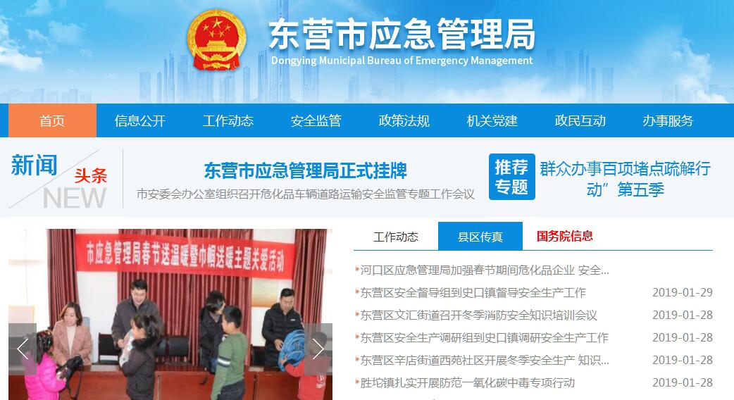 东营市应急管理局主要职责:(一)贯彻执行安全生产工作法律、法规和方针、政策,起草有关安全生产和职业卫生监管规范性文件;拟订全市安全生产政策和规划并组织实施;指导协调全市安全生产工作;负责安全生产大数据信息协调获取,分析和预测安全生产形势,发布安全生产信息,协调解决安全生产中的重大问题;指导建立完善全市安全生产风险管控和隐患排查治理双重预防机制。(二)承担全市安全生产监督管理综合职责,依法行使综合监督管理职权,指导协调、监督检查全市有关部门和各县区人民政府安全生产工作;负责组织全市安全生产大检查和专项督查;负责统计和通报安全生产情况;受市政府委托,依法组织事故调查处理工作;监督事故查处和责任追究落实情况;承担市安全生产委员会的日常工作。(三)承担工矿商贸行业安全生产监督管理职责,按照分级、属地原则,负责冶金、有色、建材、机械、轻工、纺织、烟草、商贸等行业的安全生产监督检查;依法监督检查工矿商贸生产经营单位贯彻执行安全生产法律法规情况及其安全生产条件和有关设备 (特种设备除外)、材料、劳动防护用品的配备等安全生产保障情况。(四)承担全市非煤矿山企业和危险化学品生产、经营、储存、使用以及烟花爆竹经营企业安全生产准入管理职责;依法组织并指导监督实施安全生产准入制度;负责危险化学品安全监督管理综合工作和烟花爆竹安全生产监督管理工作。(五)承担用人单位作业场所职业卫生监督检查职责;指导监督职业卫生标准中的用人单位落实职业危害因素工程控制、职业防护设施、个体职业防护等相关标准;组织查处职业危害事故和违法违规行为。(六)组织实施工矿商贸行业安全生产和用人单位职业卫生监管标准和规程;监督检查重大危险源监控和重大事故隐患排查治理工作,依法查处不具备安全生产条件的工矿商贸生产经营单位。(七)负责指导协调全市安全生产应急救援工作;指导协调和监督全市安全生产行政执法工作;综合管理全市生产安全伤亡事故和安全生产行政执法统计分析工作。(八)负责监督检查职责范围内新建、改建、扩建工程项目的安全设施、职业卫生设施与主体工程同时设计、同时施工、同时投产使用情况。(九)组织指导全市安全生产和职业卫生宣传教育工作;负责全市安全生产知识和能力考核工作;监督检查工矿商贸生产经营单位安全生产和职业卫生培训工作。(十)指导协调全市安全生产检测检验工作,监督安全生产社会中介机构和安全评价工作;负责实施注册安全工程师职业资格制度的有关工作。(十一)组织拟订安全生产科技规划,指导协调全市安全生产信息化建设、安全生产重大科学技术研究和推广工作;组织开展安全生产方面的交流与合作。(十二)承办市委、市政府交办的其他事项。