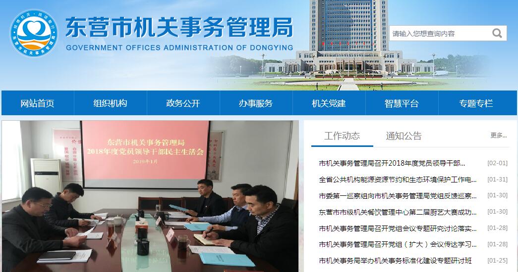 根据东编发〔2009〕10号文件精神,组建东营市市级机关事务管理局。东营市市级机关事务管理局是市政府直属的监督管理类事业单位。2015年8月,正式更名为东营市机关事务管理局。其主要职责:一、负责市级机关事务的管理、保障、服务工作;拟订市级机关事务工作和后勤体制改革的政策并组织实施;指导全市机关事务工作。二、按规定承担市级机关事业单位国有资产管理有关工作。三、负责市级机关房地产管理工作。拟订相关制度和具体管理办法并组织实施;按规定负责市级机关办公用房的建设项目审核、计划编制,会同有关部门推进市级机关办公用房的统一建设、购置和集中管理使用;负责办公用房及附属用房的权属登记、使用调配、租赁管理、维修管理等工作;负责市级机关国有土地使用权的管理工作。四、拟订市级机关公务用车管理规定并组织实施;负责市级机关公务用车的编制、配备、更新及报废工作。五、在市人民政府管理节能工作的部门指导下,负责推进、指导、协调、监督全市公共机构节能工作。会同有关部门拟订全市公共机构节能中长期规划和市级公共机构节能政策、制度并组织实施;会同有关部门组织开展能耗监测、统计、公布工作。六、为市级机关干部职工提供餐饮服务;管理维护市委市政府办公大楼。七、参与市级重要会议、重大活动、重大接待任务的总务保障工作。八、指导、协调市级机关社会治安综合治理、绿化美化、爱国卫生等社会事务工作。九、承办市委、市政府交办的其他事项。