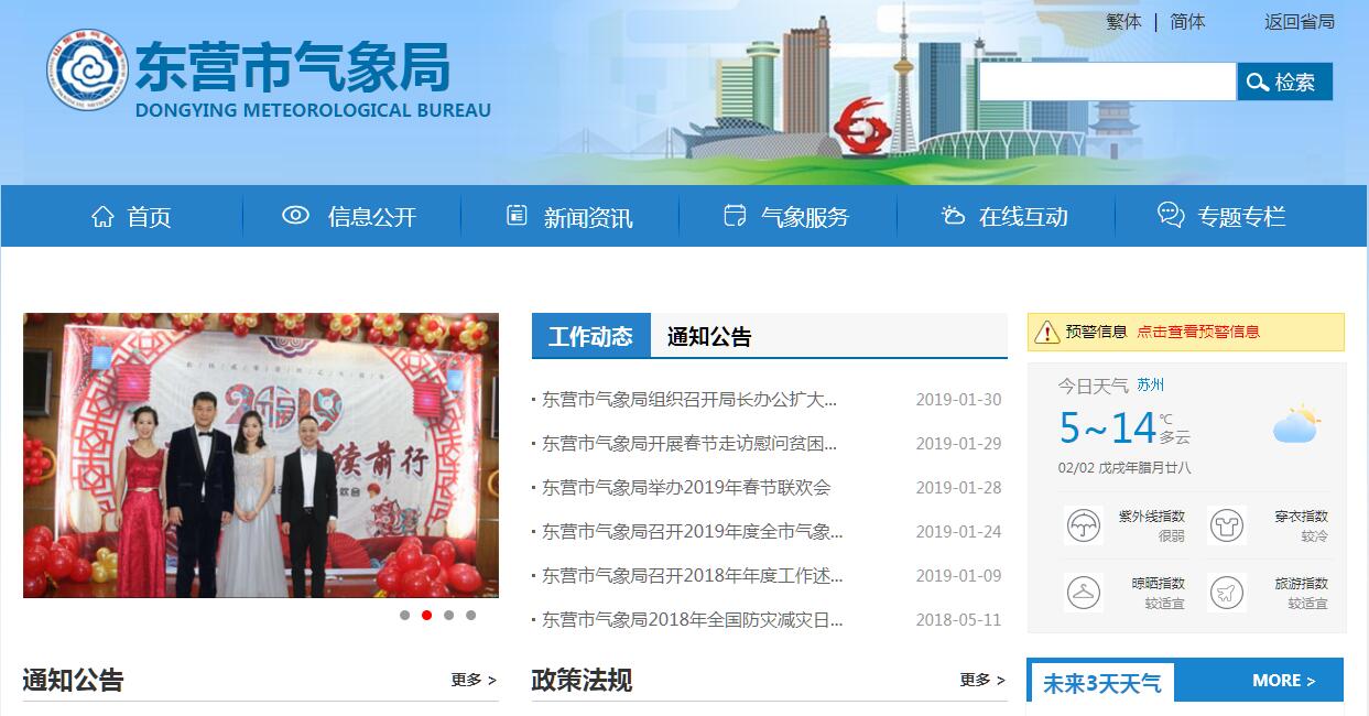 东营市气象局1994年1月正式挂牌开展工作,是上级气象部门的下属单位,也是市政府主管气象工作的部门,实行以气象部门为主与地方政府双重领导的管理体制。下辖河口、垦利、广饶、利津两区两县气象局。东营气象部门在东营市委、市政府和省气象局的正确领导下,始终坚持以科学发展观为指导,紧紧围绕全市经济社会发展,在各项工作上得到了全面发展。气象服务质量进一步提升。公共气象服务系统、气象预报预测系统和综合气象观测系统逐年完善,预报预测准确率和气象预报精细化程度不断提高,服务手段更加完善。黄河三角洲人工防雹增雨示范基地建设不断推进。人工防雹增雨工作取得了显著社会效益和经济效益,受到省政府防汛抗旱指挥部、省人工影响天气工作领导小组通报表彰。气象现代化建设水平不断提高。全国第一个石油平台声学波浪站、第一个风暴潮观测站,全省第一部边界层风廓线雷达、第一台微波辐射计和第一套新型自动气象站都在这里建成,交通气象站、大气电场仪和闪电定位仪等3个现代化建设项目被列入东营市2014 年城市公共安全提升年重要工程项目。气象防灾减灾能力得到加强。建立了气象灾害预警联动机制、气象预警信息发布“绿色通道”,为社会公众提供的气象服务更加方便快捷,防灾减灾机制更加完善。队伍素质得到全面提升。连续四届全国气象行业重要天气预报技能竞赛,东营均有选手参加并在前三届中分别获得一等奖、二等奖和优秀奖。建局以来,市气象局先后被授予全国基层台站思想政治工作先进单位、全国气象工作先进集体、全国气象部门基层文明台站标兵、全国精神文明建设工作先进单位、全国气象部门局务公开示范点、省级文明单位等荣誉称号。连年被省气象局评为全省气象部门综合目标管理优秀达标单位和全省气象服务先进集体,授予“山东省气象业务明星单位”称号。多次被市委、市政府评为防汛抗旱先进单位、支持地方经济发展先进单位;2009年和2011年,分别被市委、市政府授予“支持东营发展突出贡献奖”和“支持黄河三角洲开发建设贡献奖”。被市纪委命名为市级廉政文化示范点。下辖河口区气象局被评为省级文明单位;垦利县气象局被选作全省第一个中国气象局县级远程教育示范点。