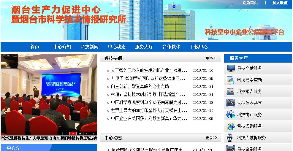 烟台生产力促进中心于1999年5月经山东省科技厅批准成立,与烟台市科技情报研究所一个机构、两个牌子,是烟台市科技局直属的副处级公益一类事业单位。2003年中心进入国家级示范生产力促进中心行列。中心编制36人。现下设办公室、咨询科、统计科、检索科、信息网络科、科技金融科、科技资源科7个科室。中心是烟台市科技信息学会的理事长单位,是苏鲁皖生产力促进服务联盟副理事长单位。中心坚持以党的十八大和十八届五中、六中全会精神为指导,贯彻落实中央、省、市加快实施创新驱动发展战略的部署要求,按照“转变服务职能、转变服务方式,提升业务素养、提升工作本领”的发展思路,积极探索适应新常态的科技服务模式和运行机制,建设和完善科技事务、科技资源和科技创新三大服务体系,以烟台市产业导航服务平台、科技报告服务系统、大型仪器共享服务系统、烟台中小企业公共服务平台、胶东汽车技术现代服务平台、烟台市大数据服务平台等网络平台为阵地和窗口,积极开展科技金融、科技统计、科技查新、科技报告、大型仪器共享、科技型中小企业认定等工作,编辑出刊《烟台科技》、《科技参考》,为政府、企业开展“港城科技千里眼”“企业顺风耳”大数据服务,已发展成为烟台市全方位、多功能、开放式的科技创新综合服务基地。中心先后完成国家、省、市各类科技计划40多项,其中国家“863”计划2项、国家科技支撑计划1项、国家火炬计划2项、创新基金2项、国家星火计划1项;取得一批具有一定影响的科技成果,其中获省科技进步奖二等奖2项,三等奖3项;获省政府系统调研优秀成果三等奖1项。中心自2010年以来连续三年被科技部评为A类国家级示范生产力中心,先后获得全国技术市场协会颁发的“科技中介服务诚信机构”、中国生产力促进中心协会评选的“杰出贡献奖”等荣誉;连续3年(2014年-2016年)在烟台市事业单位考核中获评“A级事业单位”,多次获得市科技系统先进单位称号,是市级“文明单位”。