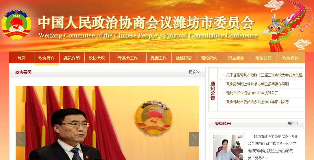 中国人民政治协商会议(简称“人民政协”),是中国人民爱国统一战线的组织,是中国共产党领导的多党合作和政治协商的重要机构。人民政协由中国共产党、各民主党派、无党派民主人士、人民团体、各民族和各界的代表,台湾同胞、港澳同胞和归国侨胞的代表以及特别邀请的人士组成。中国共产党领导的多党合作和政治协商制度是中国的一项基本政治制度。中国是一个人口众多的多民族、多党派的国家,为增进各民族、各党派、社会各界、无党派民主人士之间的团结合作,推动社会主义建设事业的发展,国家在作出重大决策之前,要同各方面的代表人物进行充分的协商。自1949年中华人民共和国建立以来,关于国家的经济建设、政治生活、社会生活和统一战线的许多重大问题,都在人民政协进行过协商。这种协商,可以通过各方面充分地展开讨论,反复地交换意见,使国家制定的各项政策和法规更加充实和完备,既符合最大多数人民的要求和愿望,又尊重少数人的合理意见。这种在决策之前进行政治协商的做法,是中国社会主义民主制度的一个重要特点和优点。中华人民共和国宪法规定:中国共产党领导的多党合作和政治协商制度将长期存在和发展。人民政协作为实现这一基本制度的重要组织形式,将在国家的政治生活、社会生活和对外友好活动中,在进行现代化建设,维护国家的统一和加强各民族的团结中,进一步发挥重要作用。潍坊市政协办公室(秘书科、组织人事科、行政财务科、信息科、老干部工作科)、研究室(综合科、调研科)、委员活动工作室(组织联络科、学习宣传科)、提案委员会(提案委员会工作室)、经济委员会(经济委员会工作室)、社会法制委员会(社会法制委员会工作室)、人口资源环境外事委员会(人口资源环境外事委员会工作室)、科教文卫体委员会(科教文卫体委员会工作室)、文史资料委员会(文史资料委员会工作室)。