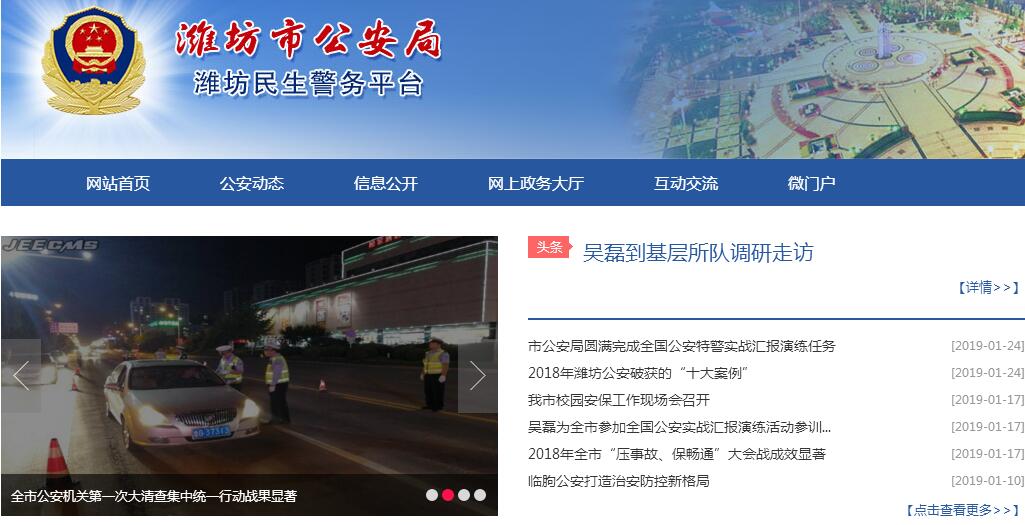 潍坊市公安机关组建于战火纷飞的1948年,伴随着共和国前进的步伐,已经走过了六十年的光辉历程。六十年来,全市公安机关和广大公安民警在市委、市政府和上级公安机关的正确领导下,坚决贯彻中央的路线方针政策,努力践行全心全意为人民服务的根本宗旨,忠实履行宪法和法律赋予的神圣职责,团结奋战,扎实工作,严密防范境内外敌对势力、民族分裂势力、宗教极端势力、暴力恐怖势力的捣乱破坏活动,严厉打击严重刑事犯罪和经济犯罪活动,积极预防、妥善处置群体性、突发性事件,改革和加强公安管理和服务工作,为巩固共产党执政地位、维护国家长治久安、保障人民安居乐业作出了积极贡献。特别是在血与火、生与死的严峻考验面前,广大公安民警继承和发扬优良传统,赴汤蹈火,舍生忘死,顽强拼搏,连续奋战,为维护国家安全和社会稳定做了大量卓有成效的工作,付出了巨大的辛劳和牺牲,建立了无愧于党、无愧于祖国、无愧于人民、无愧于时代的功绩,谱写了一曲曲人民公安为人民的奉献壮歌,赢得了人民群众的高度评价和社会各界的普遍赞誉。潍坊市公安局主要职责:公安机关是人民民主专政的重要工具,是具有武装性质的国家治安行政力量和刑事司法力量。在新时期担负着巩固共产党执政地位,维护国家长治久安,保障人民安居乐业的三大政治和社会责任。人民警察的任务是维护国家安全,维护社会治安秩序,保护公民的人身安全、人身自由和合法财产,保护公共财产,预防、制止和惩治违法犯罪活动。