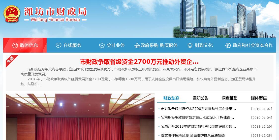 潍坊市财政局主要职责:(一)贯彻执行财政、税收、相关国有资产管理的法律、法规和方针、政策;起草有关地方性法规、规章草案,拟订有关政策和规范性文件以及财务会计规章制度并组织实施;负责推进财税体制改革,建立现代财政制度。 (二)根据国民经济和社会发展规划,拟订全市财政、税收、相关国有资产管理的中长期规划及改革方案;分析预测宏观经济形势,参与制定各项宏观经济政策;提出运用财税政策实施宏观调控和综合平衡社会财力的建议;提出有关分配政策和改革方案,拟订市与县(市、区)及国家与企业的分配政策;制定并组织实施支持产业发展的财税政策;完善鼓励公益事业发展的财税政策。 (三)承担市级各项财政收支管理的责任;负责编制年度市级预算草案、预算调整草案并组织执行,汇总全市财政预决算;受市政府委托,向市人民代表大会报告市级和全市预算及其执行情况,向市人大常委会报告调整预算、决算;组织制定市级部门经费支出标准、定额,负责汇总审核批复市级部门(单位)的年度预决算;建立完善财政支出绩效评价制度体系;承担财政体制管理工作;完善转移支付制度;开展预算绩效管理。 (四)负责全市税政管理工作,提出法定权限范围内的税收立法计划;拟订市管理权限内的税收政策,完善税收保障机制。 (五)负责政府非税收入管理,贯彻落实上级非税收入相关法律、法规、规章和制度,制定本市非税收入管理制度和政策,按管理权限做好本市非税收入的征缴、管理和监督工作;管理市级非税收入和财政专户;管理财政票据;制定彩票管理政策和有关办法,管理彩票市场和彩票资金。 (六)组织制定国库集中收付等国库管理制度;指导和监督国库业务,按规定开展国库现金管理工作;实施政府综合财务报告制度改革,牵头编制政府综合财务报告。 (七)负责制定政府采购制度并监督管理;牵头开展政府购买服务工作。 (八)制定全市行政事业单位国有资产管理规章制度,按规定负责行政事业单位国有资产综合管理;制定需要全市统一规定的开支标准和支出政策并组织实施。 (九)负责审核和汇总编制全市国有资本经营预决算草案,制定国有资本经营预算的制度和办法,制定并组织实施企业财务管理制度,按规定管理地方金融类、文化类企业国有资产有关工作,参与拟订企业国有资产管理相关制度,按规定管理资产评估工作。 (十)参与市级政府投资项目的可行性论证,提出市级财政投资的基本建设项目资金和投资计划安排意见,办理市级政府投资项目的财政拨款;负责对政府投资项目的财政性资金进行监督管理和跟踪问效,审查建设项目的工程预(概)算和竣工决算,参与制定工程取费标准;负责有关政策性补贴和专项储备资金财政管理工作;负责市级政府引导基金管理工作。 (十一)参与拟订社会保障相关事业发展规划和政策制度;会同有关部门制定社会保障资金(基金)财务管理制度并组织实施;会同有关部门编制市本级社会保险基金预决算草案、审核汇总全市社会保险基金预决算。 (十二)承担地方政府性债务管理工作,负责拟订地方政府性债务管理的制度和办法,承担政府性债务的收集审核、预算管理、统计分析和风险监控等工作;承担外国政府和国际金融组织贷(赠)款的有关管理工作;开展财税领域的国际合作与交流;承担政府与社会资本合作管理有关工作。 (十三)负责管理全市的会计工作,监督和规范会计行为,制定并组织实施会计制度;提出会计改革的政策建议;承担会计从业资格管理有关工作;承担会计专业技术资格管理有关工作。 (十四)负责全市农业综合开发管理工作;指导和推动全市农村综合改革相关工作;负责深化住房制度改革相关工作。 (十五)负责监督检查财税法规、政策的执行情况,检查反映财政收支管理中的重大问题,提出加强财政管理的政策建议。 (十六)负责制定人才发展财政保障政策并组织实施。 (十七)负责局机关及所属单位的安全监管和维护稳定工作。 (十八)承办市委、市政府交办的其他事项。