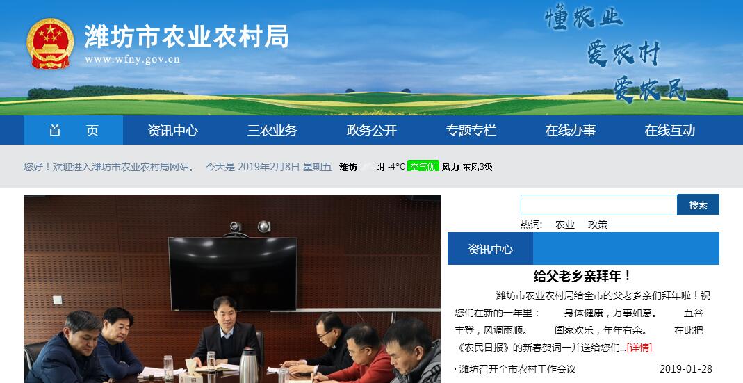 潍坊市农业农村局主要职责:(一)拟订全市农业和农村经济发展规划和年度计划并组织实施;拟订全市农业工作的政策和规范性文件并组织实施;参与拟订涉农的财税、价格、金融保险、进出口等政策,提出农业产业保护的政策建议;推进农业依法行政。(二)承担完善农村经营管理体制的责任。提出深化农村经济体制改革和稳定完善农村基本经营制度的政策建议;指导农村土地承包、耕地使用权流转和承包纠纷仲裁管理;负责减轻农民负担和村民筹资筹劳的监督管理工作,指导农村集体资产和财务管理;指导、扶持农业社会化服务体系、农村集体经济组织、农民专业合作社和农产品行业协会的建设与发展。(三)指导农产品生产,组织实施扶持和促进农业生产发展的政策措施,引导农业产业结构调整和产品品质的改善;会同有关部门指导农业标准化、规模化生产;提出农业固定资产投资规模和方向、市级财政性资金安排的建议。(四)促进农业产前、产中、产后一体化发展。拟订农业产业化经营发展规划、政策并组织实施;拟订大宗农产品市场体系建设与发展规划,提出促进大宗农产品流通的政策建议和主要农产品的进出口建议;组织协调菜篮子工程;培育、保护和发展农产品品牌。(五)承担农产品质量安全监督管理的责任。拟订全市农产品质量安全监管体系建设规划并组织实施;开展农产品质量安全风险评估,发布有关农产品质量安全状况信息;提出划定农产品禁止生产区域的建议;负责农产品质量安全监测和农业环境监测;拟订农业方面的市级技术标准和产品质量标准并组织实施;负责有关农业检验检测机构的考核工作;依法实施符合农产品安全标准的农产品认证和监督管理。(六)会同有关部门监督实施农业生产资料国家标准;指导、协调全市农业生产资料市场体系建设;依法实施农作物种子(种苗)、农药、肥料、农用膜、食用菌种、蚕种的许可和监督管理。(七)承担农业防灾减灾的责任。监测、发布农业灾情;协调种子、化肥等救灾物资储备和调拨,提出生产救灾资金安排建议,指导紧急救灾和灾后生产恢复;负责农作物重大病虫害防治和农业植物防疫检疫工作;参与拟订全市政策性农业保险制度,组织实施政策性农业保险。(八)收集、发布农业和农村经济信息,开展有关农业统计工作,监测分析农业和农村经济运行;负责农业信息体系建设,指导农业信息服务。(九)制定全市农业科研、农技推广的规划、政策并组织实施;指导农技推广体系改革与建设;组织引进农业先进技术,组织实施农业领域的高新技术和应用技术研究、农业科技成果转化和技术推广;负责农业植物新品种保护和农业转基因生物安全监督管理工作。(十)会同有关部门拟订全市农业农村人才队伍建设规划并组织实施;参与开展农村实用人才培训工作;承担农民科技培训和农村劳动力转移就业培训工作;负责农业农村人才专业技术资格和从业资格管理的有关工作;指导农业教育有关工作。(十一)组织农业资源区划工作;指导农业生态环境、农业生物物种资源的保护和管理;依法负责有关野生植物的监督管理工作;拟订耕地及基本农田质量保护与改良政策并指导实施,依法管理耕地质量;发展节水农业。(十二)拟订并组织实施全市生态农业建设规划;指导农村可再生能源综合开发与利用,指导农业生物质产业发展和农业农村节能减排;承担指导农业面源污染治理的有关工作;指导生态农业、循环农业的发展;牵头管理外来物种。(十三)承办农业涉外事务。参与拟订农业对外开放政策和外向型农业发展规划,指导农业外向型经济发展;组织开展农业贸易促进工作和国际经济、技术交流与合作,协助有关部门组织实施农业援外项目。(十四)承办全市扶贫开发工作;组织协调全市农民体育工作。(十五)负责局机关及所属单位的安全生产监管和维护稳定工作。(十六)承办市委、市政府交办的其他事项。