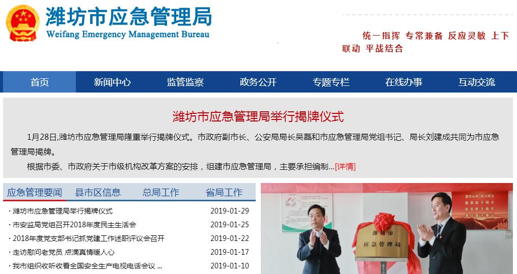 潍坊市应急管理局主要职责:(一)贯彻执行安全生产工作法律、法规和方针、政策,起草有关地方性法规、规章草案,拟订全市安全生产政策和规划并组织实施;指导协调全市安全生产工作,负责安全生产大数据信息协调获取,分析和预测安全生产形势,发布安全生产信息,协调解决安全生产中的重大问题;指导建立完善全市安全生产风险管控和隐患排查治理双重预防机制建设工作。(二)承担全市安全生产综合监督管理责任,依法行使综合 监督管理职权,指导协调、监督检查市政府有关部门和各县市 区政府、市属各开发区管委会安全生产工作;负责统计和通报安全生产情况。(三)承担工矿商贸行业安全生产监督管理责任,按照分级、属地原则,依法监督检查工矿商贸生产经营单位贯彻执行安全生产法律法规情况及其安全生产条件和有关设备(特种设备除外)、材料、劳动防护用品的安全生产管理工作。(四)承担全市非煤矿矿山企业和危险化学品、烟花爆竹生产企业安全生产准入管理责任,依法组织并指导监督实施安全生产准入制度;负责危险化学品安全监督管理综合工作和烟花爆竹安全生产监督管理工作。(五)承担工矿商贸作业场所(煤矿作业场所除外)职业卫生监督检查责任;组织查处职业危害事故和违法违规行为。(六)拟订工矿商贸行业安全生产地方标准和规程并组织实施;监督检查重大危险源监控和重大事故隐患排查治理工作,依法查处不具备安全生产条件的工矿商贸生产经营单位。(七)负责组织市政府安全生产大检查和专项督查,根据市政府授权,依法组织较大事故调查处理和办理结案工作,监督事故查处和责任追究落实情况。(八)指导协调全市安全生产应急救援工作;指导协调和监督全市安全生产行政执法工作;综合管理全市生产安全伤亡事故和安全生产行政执法统计分析工作。(九)负责监督检查职责范围内新建、改建、扩建工程项目(煤矿除外)的安全设施、职业卫生设施与主体工程同时设计、同时施工、同时投产使用情况。(十)组织指导全市安全生产宣传教育工作,负责全市安全生产监督管理人员的安全培训、考核工作;组织指导并监督特种作业人员(煤矿特种作业人员、特种设备作业人员除外)的考核工作和工矿商贸生产经营单位(煤矿除外)主要负责人、安全生产管理人员的考核工作; 监督检查工矿商贸生产经营单位安全 生产和职业安全培训工作。(十一)指导协调全市安全生产检测检验工作,监督管理安全生产社会中介机构和安全评价工作;负责实施注册安全工程师执业资格制度的有关工作。(十二)组织拟订安全生产科技规划,指导协调全市安全生产信息化建设、安全生产重大科学技术研究和推广工作;组织开展安全生产方面的交流与合作。(十三)承担市政府安全生产委员会的日常工作。(十四)负责局机关及所属单位的安全生产监管和维护稳定工作。(十五)承办市委、市政府交办的其他事项。
