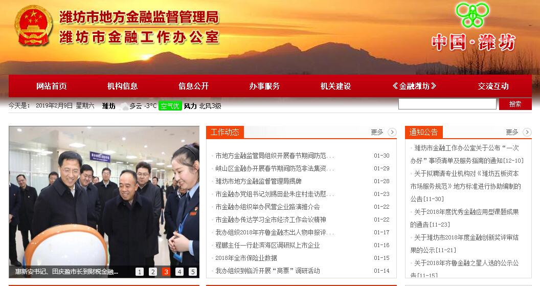 1月28日上午,潍坊市地方金融监督管理局举行揭牌仪式。副市长田民利出席仪式,并与市地方金融监督管理局党组书记刘锡田共同为市地方金融监督管理局揭牌。市地方金融监督管理局局长程鹏及其他班子成员、全体工作人员参加揭牌仪式。根据市委、市政府《关于潍坊市市级机构改革的实施意见》,将市商务局的典当行、商业保理公司的经营监督管理职责划入市金融工作办公室,市金融工作办公室(市地方金融监督管理局)更名为市地方金融监督管理局,保留市金融工作办公室牌子,仍作为市政府工作部门。在揭牌仪式上,田民利副市长要求市地方金融监督管理局全体干部职工以此次揭牌为契机,深入贯彻落实好中央和全省、全市经济工作会议精神,紧紧围绕服务实体经济、防控金融风险、深化金融改革等具体任务,不断建立健全地方金融监管体制机制,改进和完善地方金融监管方式,完善地方金融组织事中事后监管制度,全面提高地方金融监管水平和风险防范能力,打好防范化解金融风险攻坚战,坚决守住不发生区域性、系统性金融风险底线,助推全市经济社会高质量发展。其主要职责:(一)贯彻执行金融工作法律、法规和方针、政策;起草有关地方性法规、规章草案;研究分析金融形势、国家金融政策和全市金融运行情况;拟订全市金融业发展规划、政策和规范性文件,提出改善金融发展环境、促进金融业发展的建议。(二)负责协调、配合中央驻潍金融监管机构对全市各类金融机构的监管;负责依法对地方金融组织和相关金融活动实施监管;负责联系协调驻潍金融机构,做好相关服务工作;负责对地方金融组织的行业自律组织进行指导和管理;协调解决金融业发展中应由地方政府解决的矛盾和问题,为金融业发展提供良好环境;协调、引导、鼓励金融机构为地方经济社会发展提供金融服务。(三)指导、协调、组织地方金融机构的改革发展工作,负责地方金融机构重大事项的指导、协调工作,配合有关部门做好市属金融机构的管理工作。(四)拟订全市多层次资本市场培育、改革和发展的政策措施并组织实施;配合证券监管部门对辖区上市公司和直接融资活动进行监督管理,同时配合做好全市企业上市辅导、规划发展及跟踪监测全市上市公司经营情况等工作;负责监测全市证券、期货经营机构的运行情况。(五)负责对小额贷款公司进行准入辅导、日常监管和风险防范与处置。(六)负责民间融资机构监管工作,制定完善民间融资机构发展政策措施,做好风险防范处置等工作;负责对融资担保公司进行申报辅导、可行性论证、日常监管和风险处置。(七)根据经济发展需要,对重大资本运营提出建议,参与策划、指导重大资产整合,企业重组等工作。(八)组织协调有关部门防范化解地方金融风险,处理地方金融突发事件和重大事件;协调有关部门依法做好防范和处置非法集资和非法证券活动。(九)负责全市交易场所开展权益类交易和介于现货与期货之间的大宗商品交易业务的许可受理与辅导、日常监督检查和统计监测等工作;负责对地方金融控股公司进行业务指导和监督;负责全市网络借贷信息中介机构的机构监管工作。(十)协调、组织有关部门推动新型农村金融机构的规范发展,拟订全市农民专业合作社信用互助业务的政策措施,负责对农民专业合作社依法开展的信用互助业务进行指导、监督。(十一)承担中共潍坊市委金融工作委员会的日常工作。(十二)会同有关部门拟订全市金融人才队伍建设规划并组织实施;负责金融领域对外开放工作。(十三)负责办机关及所属单位的安全生产监管和维护稳定工作。(十四)承办市委、市政府交办的其他事项。