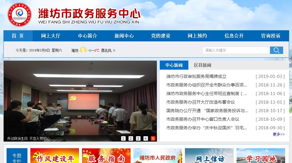 潍坊市政务服务中心于2003年7月1日正式对外办公,2010年底迁至阳光大厦附楼。现中心大厅建筑面积12000平方米,进驻44个部门(单位),工作人员325名,行政许可事项461项,其他权利事项364项。主要划分为三个功能区:一楼为总服务台、自助服务区和便民服务区,主要办理面向公民个人的便民服务事项;二楼为投资服务区和中介服务区,主要办理企业设立和基本建设项目及配套服务事项;三楼为综合服务区和交易服务区,主要办理综合服务业务和公共资源交易事项。2007年,依托市公共行政服务中心,组建了市投资创业服务中心和公共资源交易服务中心,形成了集行政服务、投资创业服务和公共资源交易服务“三位一体”的综合性政务服务平台。中心实行“集中办公、窗口受理、一口对外、承诺服务、全程公开、限时办结、统一收费”一站式服务制度。各部门均选派业务骨干进驻大厅,并刻制了加“2”字的第二公章,签订了授权委托书,实行领导带班制度。建立了集办件管理、收费管理、监督管理、客观评价于一体的电子网络办公系统。具体实行五制式运作:一般事项现场办结制,复杂事项承诺服务制,联办事项同步办理制,上报事项负责办理制,投资事项集中办理制。潍坊市政务服务中心自2015年1月开始实行了较大改革,成立了政务服务中心管理办公室与市行政审批制度改革领导小组办公室合署办公,为市政府派出机构。成立了中心党委、纪委,建立了健全了工会等群团组织。中心以建设全市“三级联通、一体运行、公开透明、便捷高效”的政务服务体系为工作目标,积极推进行政审批制度和公共资源交易两项改革,抓好党的建设、机关建设和政务服务中心平台建设,在审批制度改革、投资服务创新、公共资源交易管理创新、政务服务中心平台管理、网络与信息数据开发利用上实现了新的突破。其主要职责:1、办理面向经济、社会和人民群众和各类审批事项,包括工商企业工商营业执照、生产经营许可证及需要审批、核发的有关批准文件和证照;涉及基本项目所需的有关批准文件及证照等。2、办理人民群众日常生活中所需的各种证照,受理水、煤气、电信等基础设施使用权申请手续。3、统一代收各职能部门和行业服务部门在办理各类批准件、证、照过程中的有关行政性和服务性收费。4、负责收集、整理现行的涉及各方面的法律法规、政策及规范性文件,建立查询数据库并向社会公布,为公众提供法规、政策查询服务。5、为国内外来潍投资者从事各种经济活动提供相关的咨询及服务。6、监督窗口服务行为并受理投诉。