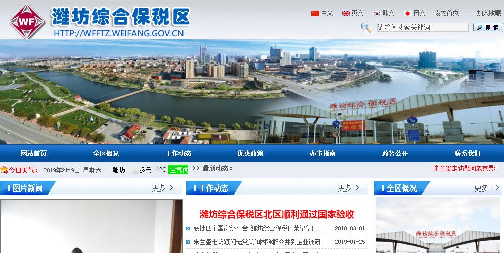 | 网站简介: 潍坊综合保税区于2011年1月25日获国务院批准设立,是全国第14个综合保税区。总规划面积35平方公里,其中网内保税区5.17平方公里,网外配套区29.83平方公里。分为南区、北区两部分,南区主要依托青岛机场和青岛港,为潍坊及周边地市企业服务;北区主要依托潍坊港、面向东北亚,为北部沿海2700平方公里地区服务,两区各有服务重点,又相互补充、相互融合,使潍坊综合保税区的功能政策覆盖全市、辐射全省,形成“一体两翼”发展格局。潍坊综合保税区具有“保税加工、保税物流、货物贸易、服务贸易、虚拟口岸”五大功能和“进境保税、入区退税、免增值税、区港直通、集中申报、快速中转”等优惠政策,具有“承东启西”的辐射带动作用,服务辐射半径达300公里,向东承接青岛、烟台、威海等沿海城市,向西服务淄博、滨州、东营等内陆城市,对全市、全省的经济发展有重要的政策服务、项目聚集和国际化平台作用。 |