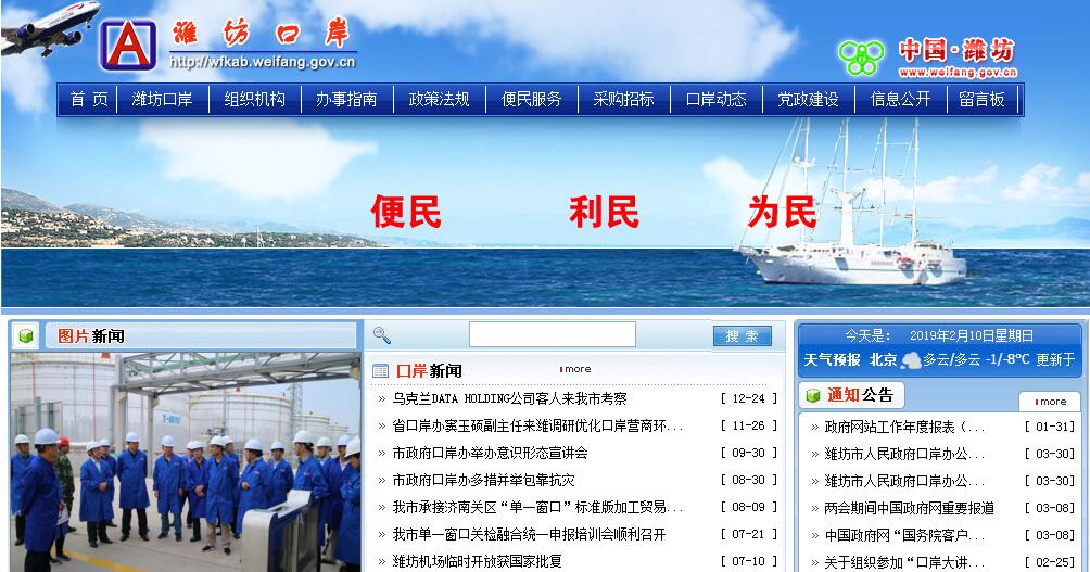 2007年10月国务院批复同意潍坊港对外开放以来,我市依照口岸对外开放的标准,全面搞好港口基础设施和查验设施建设,努力创造良好的通关环境。2008年10月31日,潍坊港口岸通过了省级预验收,2009年4月17日,顺利通过国家了验收,同年6月27日,国家交通运输部发布公告,宣布山东潍坊港口岸自2009年7月28日起正式对外开放。这是我省“十一五”期间实现对外开放的唯一海港口岸,是我市加快黄河三角洲开发、打造山东半岛蓝色经济区的重要成果。标志着潍坊拥有了对外开放的“国门”,潍坊将在更大范围、更宽领域、更高层次上参与国际经济交流与合作。潍坊港始建于1996年,位于渤海莱州湾山东潍坊滨海经济开发区海岸,地处环渤海经济圈黄金地带和东北亚区域经济合作的前沿,是鲁中、鲁北、鲁西物资出海陆路运距最短、最便捷的港口。潍坊港总体布局为以主航道为轴心“双堤环抱”单一口门的环抱港区,码头形式为离岸式港岛码头。在码头现场建设了隔离围网、通关查验处理区、查验平台、监控传输网络设施;在港区建设了联检办公服务大楼,建成了国内一流的口岸通关联检大厅;在市区内建设了潍坊边检站、监护营房和海事船检合署业务楼等口岸办公设施,并配备了必要的办公生活设备,满足了查验工作需求。与此同时,积极协助查验单位推进机构设置和人员配备工作,目前,海关、检验检疫、海事、边检等查验单位均在口岸设立了办事机构,配备了工作人员。引航、船代、货代、外理、外供等通关配套机构已取得相应资质。目前,潍坊港中港区已拥有开放范围的泊位有7个,码头岸线1705米,年设计吞吐能力达到了799.4万吨。3个万吨级通用泊位已列入山东省2013年度口岸开放计划。2012年潍坊港港口吞吐量首次突破2000万吨。森达美港(中港区)作为潍坊港的主港区,依托国家级的滨海经济开发区,是以散杂货运输为主、临港工业所需原材料及产成品运输为辅的综合性港区。西港区依托省级寿光羊口经济开发区,主要为后方农业产业园及现代制造业园服务,积极开展海河联运。东港区依托省级的昌邑下营经济开发区,主要为后方滨海开发区发展建设服务。初步构成了潍坊港“一主两辅、功能互补、多点并进、统筹发展”的框架。目前,潍坊港已同韩国、日本、俄罗斯、朝鲜、台湾等国家和地区的20多个港口有贸易往来,货种主要包括:铝土、煤炭、石油及天然气制品、原盐、铁矿、陶土、纯碱等30多个品种,货源涵盖化工、能源、粮食、造纸、建筑、机械加工等多个行业领域,是山东省地区性重要港口。市委、市政府着眼于发挥潍坊港腹地辽阔、资源丰富、货源充足的区位优势,不断增强港口的辐射力和核心竞争力,全方位优化港口发展环境。近几年来,在潍坊北部逐步构筑起了集公、铁、水、空于一体的立体化交通体系,增强了潍坊港口岸的辐射带动功能;目前,正在加紧规划建设滨海新城,努力培育电力能源、海洋化工、机械装备、临港物流等产业集群,为潍坊港口岸运营提供货源支撑和流通支持,不断优化口岸经济发展的社会环境。下一步,我们将在市委、市政府的正确领导下,以科学发展观为指引,以山东半岛蓝色经济区开发和高端制造业基地建设为契机,努力打造功能齐全、设备先进、管理科学的现代化海港口岸,充分发挥潍坊港口岸在半岛蓝色经济区发展中的基础性作用,为全市乃至全省的经济社会又好又快发展做出新的贡献。根据工作需要,市委、市政府研究决定,成立潍坊市人民政府口岸办公室,该单位为正县级事业单位,直属市政府领导。主要职责是:(一)贯彻执行国家及省有关口岸管理的法律、法规和规章;拟定我市有关政策规定,并组织实施。(二)编制并组织实施全市口岸开放规划和计划,组织验收和审查上报口岸开放与关闭,办理报批外国籍交通运输工具临时进出非开放口岸事宜,组织协调有关部门开辟国际客运、货运航线。(三)会同有关部门审查上报口岸检查检验机关人员编制及其配套设施建设资金事宜,检查督促辖区口岸配套设施建设和改造。(四)督促检查口岸检查检验机关按照各自的职责和规定对出入境人员、交通运输工具、货物和行李物品进行监督管理以及检查、检验、检疫等。(五)主持平衡辖区口岸外贸运输计划,组织协调口岸单位共同做好口岸集疏运和出入境旅客接送工作。(六)协调处理或者裁决口岸单位之间发生的影响口岸正常运转的争议。(七)组织口岸单位对工作人员进行涉外政策、纪律和国家安全教育。(八)查处违反口岸管理法律、法规的行为,会同有关部门查处口岸重大涉外事件。(九)组织口岸单位开展共建社会主义精神文明口岸活动。(十)潍坊市人民政府授予的其他职责。