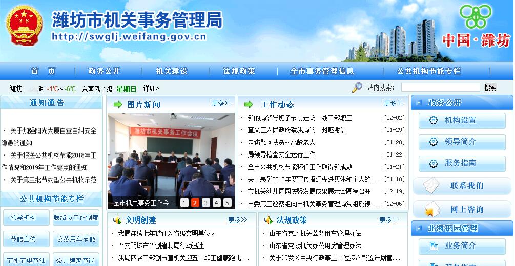 根据中共潍坊市委、潍坊市人民政府印发的《潍坊市人民政府机构改革实施意见》(潍发〔2010〕3号),将潍坊市市级机关事务管理局和潍坊市市级机关综合办公大楼管理处合并,组建潍坊市市级机关事务管理局,为市政府直属事业单位,正县级规格。其主要职责:(一)负责市级机关事务的管理、保障、服务工作。拟订市级机关事务工作和后勤体制改革办法并组织实施;指导全市机关事务工作。(二)按照规定配合有关部门,具体承担市级机关国有资产管理等有关工作。根据规定和授权管理市级机关有关国有资产;负责对房产管理范围以内的住房资金提出使用计划,经财政部门批准后组织实施。(三)负责市级机关有关房产的综合管理工作。拟订市级机关有关房产综合管理的规章制度并监督执行;按规定负责集中办公用房的建设项目审核、计划编制,会同有关部门推进市级机关办公用房的统一建设、购置和集中管理使用;负责集中办公用房的权属登记、使用调配、租金管理、维修管理等工作。(四)负责市级机关集中住宅区的建设和管理工作;管理市级机关周转房。(五)在市政府管理节能工作的部门指导下,负责推进、指导、协调、监督全市公共机构节能工作。会同有关部门拟订全市公共机构节能中长期规划和节能政策、制度并组织实施;会同有关部门组织开展能耗监测、统计、公布等工作。(六)负责市级机关集中办公区、住宅区人防工程的建设和管理工作。(七)会同有关部门搞好市级机关政府采购工作。(八)参与市级重要会议、重大活动、重大接待任务的总务保障工作。(九)负责市级机关有关办公区、住宅区的安全保卫及生活保障服务工作。(十)管理市机关幼儿园。(十一)负责局机关及所属单位的安全生产监管和维护稳定工作。(十二)承办市委、市政府交办的其他事项。