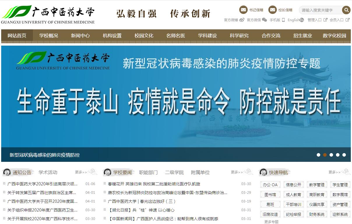 广西中医药大学创建于1956年,其前身是1934年成立的广西省立南宁区医药研究所,是我国5个少数民族自治区中唯一独立建制的高等中医药院校。2012年3月经国家教育部批准正式更名为广西中医药大学,也是国家中西部基础能力建设高校及国家中医药管理局与广西壮族自治区共建高校。学校以中医药学科为主,医、理、工、管等多学科协调发展,具有鲜明中医药、民族医药特色,产学研医紧密结合、对外交流合作优势突出,有仙葫、明秀2个校区,总占地面积1310.99亩。设有14个学院,3个直属公共教学部。有14所附属医院(其中直属附属医院3所,地方附属医院11所),1所附设中医学校,1家校办制药厂,1所独立学院。有重阳城老年公寓等一批在全国行业内有一定影响力的产学研基地和教学实践基地。学校拥有一支教学经验丰富,结构合理的师资队伍,有专任教师991人,外聘教师161人。专任教师中正高职称192人;具有博士学位的有267人;有博士生导师25人、硕士生导师693人。现有国医大师1人、全国名中医2人、全国老中医药专家学术经验继承工作指导老师25人、国务院特殊津贴专家16人、全国优秀教师3人、教育部“新世纪优秀人才支持计划”人选3人、全国中医药高等学校教学名师1人、广西终身教授1人、广西“十百千人才工程”人选7人、广西特聘专家3人、广西八桂学者2人、广西“八桂名师”2人、广西高校“教学名师”4人、广西高校卓越学者2人、广西“桂派中医大师”17人、广西名老中医18人、广西名中医64人,省级创新团队7个。学校牢固树立“立德树人”的育人观,坚持教学中心地位,大力实施“人才强校、质量兴校”战略。现有全日制在校生14000多人,有本科专业25个,其中有国家综合改革试点专业1个、国家级特色专业3个、卓越医生(中医)教育培养计划改革试点项目2个、省级优质特色专业(群)9个、省级特色专业与课程一体化建设项目6个。学校是博士学位授予单位,有博士学位授权一级学科1个、硕士学位授权一级学科6个,博士专业学位类别1个、硕士专业学位类别3个,二级学科硕士学位授权学科43个,是硕士研究生推免资格高校;有国家临床重点专科10 个,国家中医药管理局中医药重点学科14 个,国家中医药管理局中医药重点培育学科4 个,国家中医药管理局重点专科9 个。2015年以来,学校顺利通过教育部本科教学工作审核评估和中医学、临床医学、护理学、中药学专业认证,中医学专业认证获得教育部专家组的“完全认可”,临床医学专业认证有效期为6年。毕业生就业率及就业质量不断提升,连续8年荣获“全区高校毕业生就业工作先进集体”称号。学校以中医药、壮瑶医药研究为重点,加强科研创新基地与科技创新平台建设,广西中医药科学实验中心是全国中医药民族医药最大的创新共享平台之一。有1个中-泰传统药物研究联合实验室,4个国家中医药管理局中医药科研三级重点实验室,3个广西壮族自治区重点实验室,1个广西壮族自治区重点实验室培育基地,拥有广西首批“2011协同创新中心”各1个,广西“2011协同创新中心”建设基地2个、校地校企共建科技创新平台3个。1970年开始,赵一教授参与屠呦呦“523”的疟疾防治科研项目工作,在青蒿素的药理作用、作用机制等方面作出了重要的贡献。韦贵康教授提出的“脊柱相关性疾病及颈性高血压学说”,邓家刚教授的“化学中药学说”,刘力红教授的《思考中医》以及唐农教授提创的“中医阴阳本体学说”,均在行业内具有广泛影响。中医“扶阳学派”“八桂学派”“黄氏壮医针灸”“本土学派”等多个学术流派,形成了百家争鸣、百花齐放的学术氛围。近三年来,学校共承担国家级科研项目126项,省部级项目178项,厅局级项目633项。学校获得各级各类科技奖励63项,其中省部级以上奖励30项。出版科技专著62部,发表科技论文3524篇,其中SCI收录论文137篇;获国家专利授权60项,软件著作权登记2项。学校坚持“以服务为宗旨,在贡献中求发展”,积极投身地方经济社会主战场。加快科研成果转化。以学校第一附属医院、附属瑞康医院、制药厂为依托,学校有36个国药准字号药品、200多种院内制剂、10多种成果转化产品,复方扶芳藤合剂、龙血竭、芒果止咳片已成为广西中医药大学制药厂的拳头产品,青蒿素、绞股蓝等系列产品也为广西多个制药企业的发展创造了良好的经济效益。“大宗农作物废弃物功能成分筛选及产品开发研究”及“海水无核珍珠产业化养殖关键技术与应用”等研究成果转化投入生产,产生了显著的经济效益和良好的社会效益,为地方经济建设作出重要贡献。医疗卫生技术协作帮助企事业单位解决难题。近年来,学校利用中药药效筛选实验室等省级重点实验室和两所直属附属医院的“国家药品临床研究基地”等系列技术平台,学校先后为区内外25个省区的100多家医药企业、科研院所或个人提供技术服务,完成了上百个中医药品种的处方论证、毒理试验、药效筛选与评价等研究,产生了很好的经济效益和社会效益。同时学校还提供原料检测、中药质量真伪优劣评价,中药农药残留等技术服务,长期与广西各医药企事业单位、科研院所进行质量标准、成分提取、含量测定等方面的合作研究,从而建立起中医药科技服务平台。仁心智力服务广西新发展。学校积极参与政府起草《广西壮族自治区发展中医药壮