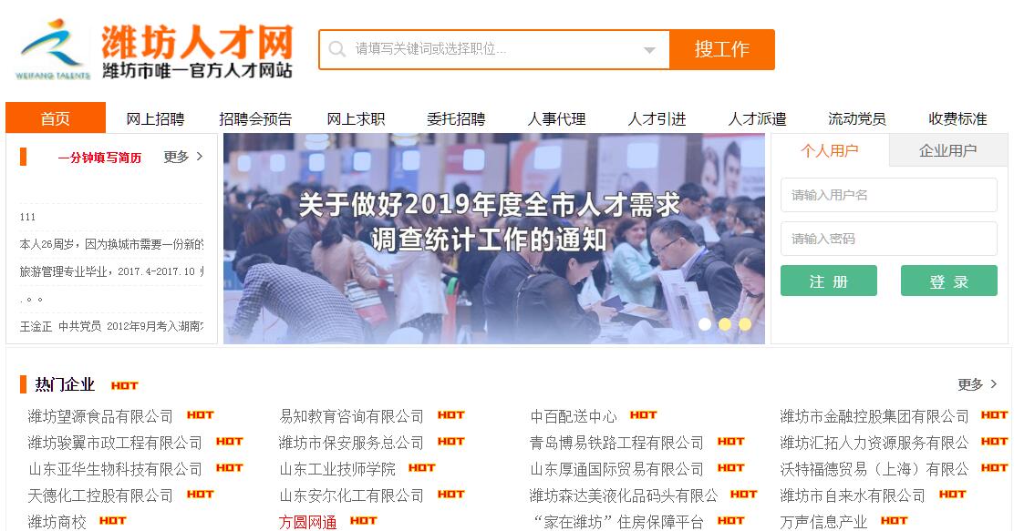 潍坊人才网由潍坊市人力资源管理服务中心主办。潍坊市人才服务中心是潍坊市人事局所属的、以促进人才资源开发与合理流动、提供人才供求信息与政策咨询为服务内容的副县级事业单位,下设潍坊人才市场。是中国人才行业协会会员、山东省人才中介行业协会理事。2006年12月,经国家外国专家局批准,成立了“中国国际人才市场潍坊市场”。2007年2月,通过了ISO9001质量管理体系认证。中心设综合部、市场招聘部、人事代理部、人才开发部、国际业务部、信息策划部和方舟人力资源开发有限公司,具有人才招聘、人事代理、人才培训、人才测评、人才派遣、人才猎头、国际人才服务等功能。是目前全市运作管理最规范、服务功能最完善、服务手段最先进的大型人才服务机构。潍坊人才市场位于市中心繁华地段,建筑面积4200平方米,人才招聘大厅1400平方米,设有150个标准化固定展位,拥有先进的计算机信息网络系统、大型电子显示屏和广告灯箱、自动化档案管理库以及中央空调等现代化办公及服务设施,为客户提供全方位、高品质、人性化的服务。2006年,入场招聘的用人单位5000多家,入场求职的各类人才15万人次,有6万余人实现了就业和再就业,为3万余名各类人才提供了人事代理服务,充分发挥了市场化配置人才资源的基础性和主渠道作用,为促进就业、服务经济、构建和谐社会提供了强有力的人才智力支持。面对新的机遇、新的挑战,潍坊市人才服务中心全体员工将秉承团结、敬业、创新、高效的工作宗旨,全面落实“吸纳一流企业、聚集一流人才、创建一流市场、提供一流服务”的质量目标,开拓进取,争先创优,努力开创人才服务工作新局面!