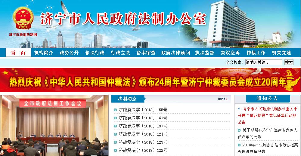济宁市政府法制办公室(挂济宁市行政执法监督局牌子)是主管全市政府法制建设的市政府工作部门。主要职责是:(一)调查研究依法行政和政府法制建设中出现的新情况、新问题,提出推进依法行政的具体措施和工作建议;承担市政府推进依法行政日常工作;负责全市依法行政的综合协调、督促检查和政策研究。(二)承担市政府重大决策、合同的合法性论证审查工作。(三)负责统筹规划市政府规范性文件制定工作,拟订市政府年度规范性文件制定计划,报经市政府批准后组织实施。(四)承担审查报送市政府的规范性文件草案的责任;负责起草或组织起草重要的规范性文件草案;负责市政府规范性文件草案向社会公开征求意见,负责法律草案、法规草案、规章草案征求意见的办理工作。(五)承办市政府规范性文件的解释工作;负责规范性文件实施情况的评估工作;负责清理、编纂规范性文件,对规范性文件提出清理或者修改意见。(六)负责市政府各部门、各县(市、区)人民政府制定的规范性文件的备案审查工作,审查其同宪法、法律、行政法规、地方性法规、省政府规章、市政府规范性文件是否抵触以及它们相互之间是否矛盾,根据不同情况提出处理建议。(七)研究行政诉讼、行政复议、行政赔偿、行政处罚、行政许可、行政收费、行政执行等法律法规规章实施以及行政执法中带有普遍性的问题,向市政府提出完善制度和解决问题的建议。(八)负责组织全市行政执法人员的法律知识培训、考试;负责行政执法资格审查;办理行政执法人员资格证书;承办行政处罚听证主持人、行政复议应诉人员的资格审查和培训考试工作。(九)负责对市政府机关及县(市、区)人民政府的行政执法行为进行监督检查;协调部门之间在法律法规规章实施中的矛盾和争议;参与推进行政审批制度改革工作,依法对行政许可(审批)事项进行清理审查,监督检查各行政许可机关的行政许可行为;承担推进相对集中行政许可权工作,负责并指导有关部门推进相对集中行政处罚权工作;审查须经市政府批准或作出的行政处罚决定。(十)负责推行行政执法责任制;负责组织协调和执法责任制的评议考核工作;承办行政执法错案责任追究事项。(十一)承担市政府行政复议事项,指导、监督全市的行政复议应诉工作;受市政府委托代理行政应诉和其他诉讼案件;负责有关市级行政赔偿的协调工作;参与本地区重大涉法案件的处理工作。(十二)负责依法行政和政府法制的信息公开、宣传和新闻发布工作;承担市政府法制咨询委员会的日常工作;承担市政府领导集体学法讲座的具体工作;开展对外法制工作情况交流;为市政府领导和各部门提供法律咨询服务和法制信息服务。(十三)指导、协调仲裁工作。(十四)承办市委、市政府交办的其他事项。