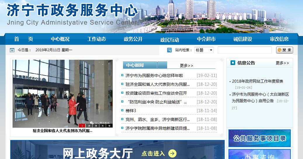 济宁市政务服务中心管理办公室成立于2002年6月,正县级行政单位,市政府派出机构,核定行政编制16名,内设综合科、业务科、督查科(挂分中心管理科牌子)、电子政务科、机关党委(挂人事科牌子)。中心成立以来,在市委、市政府正确领导和各部门单位的大力支持配合下,认真贯彻落实国务院、省市政府关于“简政放权、放管结合、优化服务”,转变政府职能的一系列决策部署,锐意进取,大胆创新,狠抓落实,政务服务效能不断提升,服务环境进一步优化,思想面貌、工作作风迈出新的步伐。截止目前,具有许可职能的41个市直部门单位全部进驻中心集中办公,设置服务窗口41个,工作人员138名,承办许可项目288项。先后荣获山东省服务名牌、国家级、省级青年文明号、市级文明机关、市级理论教育先进单位、市级文明单位等荣誉称号;中心所属窗口多次获得全市“十佳”文明窗口、全市“十佳”基层单位等荣誉称号。初步统计,济宁市政务服务中心已累计受理审批服务事项140余万件,按时办结率在98.8%以上,群众满意度始终保持在98%以上。其主要职责:一、贯彻执行国家和省、市深化行政审批制度改革、加强政务服务工作的方针、政策、法律、法规和市委、市政府的决策部署。二、制定全市推进政务服务管理的制度、办法、标准和监管细则并组织实施。三、对各部门行政审批事项的办理进行组织协调、监督管理和指导服务。四、会同有关部门制定审批事项联合办理规程并组织实施。五、对进驻市政务服务中心的窗口及工作人员进行日常管理和考核,受理对窗口及工作人员审批服务行为的投诉、举报,并会同有关部门按规定处理。六、负责全市行政审批和政务服务电子网络一体化建设与管理;强化信息公开,扩大网上办理范围,建立和维护网上办事平台;加强对行政审批和政务服务过程全程行政电子监察。七、指导协调全市政务服务体系建设,对分中心和县(市、区)政务服务中心进行业务指导和监督。八、对进驻政务服务中心的中介服务机构进行监督管理。九、承办市委、市政府交办的其他事项。