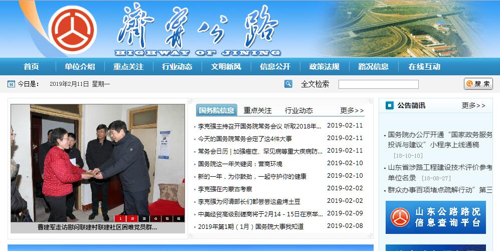 | 网站简介: 济宁市公路管理局成立于1950年,是正县级事业单位,主要负责济宁市国省干线公路的规划、设计、建设、养护、路政管理和通行费征收等工作;下设12个县(市、区)公路局、11个直属单位和19个内设科室。截至2017年3月,全局共有干部职工2079人。近年来,在省交通运输厅、厅公路局和济宁市委、市政府的坚强领导下,济宁市公路管理局全面加快公路现代化建设步伐,日兰高速、济徐高速、G104、G105、G327、滨河大道、北环东延等一大批重点公路项目相继通车,跨湖高速、董梁高速、G105济宁西二环等重点项目2016年底集中开工建设。目前,济宁市共有京台、日兰、济菏、济徐4条高速公路和7条普通国道、14条普通省道,通车里程1636.7公里,其中济宁市公路管理局管养里程1214公里,为加快济宁市经济社会发展、全面建成小康全面转型振兴发挥了优质高效的先行作用。目前,全局建成省级文明单位 16个,市级文明单位22个,建成国家级“青年文明号”1个、省级“青年文明号”6个;2015、2016连续两年被济宁市委、市政府授予“全市科学发展综合考核先进集体”、“群众满意先进单位”。 |