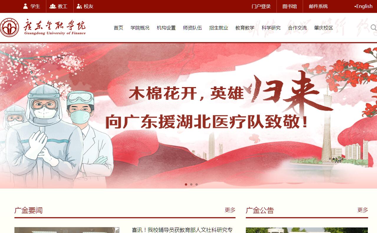 广东金融学院是一所省属公办普通本科院校,是华南地区唯一的金融类高校。学校由中国人民银行创办于1950年,是一所具有“央行基因”的院校。2004年,经教育部批准,学校从“专科”升格为“本科”,招收第一批本科生;2012年,招收第一批金融专业硕士研究生;2012年,招收第一批港澳台生;2014年,招收第一批留学生;2016年,与英国诺丁汉大学、宁波-诺丁汉大学合作,联合招收博士研究生。学校秉承“明德、敏学、笃行、致远”的校训,弘扬“励学乐教、求实拓新”的精神,坚持“金融为根、育人为本、应用为先、创新为范”的办学理念,依托行业,立足广东,面向全国,以经济社会需求为导向,培养富有创新精神和社会责任感的高水平财经类应用型人才。建校67年来,学校为社会培养输送了20多万名各类人才,被誉为“华南金融人才摇篮”和“南粤金融黄埔军校”,被社会评价为“人才培养有人气、应用研究接地气、金融行业有名气”。学校现有广州校本部和肇庆校区,总占地面积近900亩。广州校本部位于天河龙洞,肇庆校区位于七星湖畔。学校设有18个学院(校区、部),现有本科专业44个,涵盖经济学、管理学、法学、文学、理学、工学6个学科门类,形成了以经济学、管理学、法学为主干,以文学、理学、工学为支撑的大金融学科格局。金融学、应用经济学、工商管理和经济法学是广东省重点学科,金融学是教育部特色专业。开办了全国首批、广东首个互联网金融专业和广东首个精算学专业,拥有同类高校中最为齐全的金融类专业体系。金融学科实验教学示范中心是国家级实验教学示范中心,金融学科虚拟仿真实验中心是国家级虚拟仿真实验中心,浦发银行广州分行实践教学基地是国家级大学生校外实践教学基地。同时拥有一大批省级精品课程、省级人才培养模式创新实验区、省级应用型人才示范基地、省级协同育人平台和省级教学科研团队。学校现有全日制普通本科生近2.3万人,全日制专业硕士研究生120多人,外国留学生160多人,成人教育本专科生近2.4万人。教职工1200多人,其中专任教师近千人。还在学界、业界和政界聘请了一批兼职(名誉)教授。学校坚持开放办学,加强校际、校政和校企协同合作。学校与美国西阿拉巴马大学、英国西英格兰大学、澳大利亚西澳大学等40多所国(境)外知名高校合作,联合培养本科生和研究生。与英国诺丁汉大学合作成立“广东-诺丁汉高级金融研究院”,开展高端金融人才培养、高端金融研究、高端智库建设;与中国人民银行金融研究所、广东省金融办、中国人民银行广州分行等机构合作,共同举办高端论坛,合作编制发布金融创新白皮书,组建金融智库联盟。与梅州、揭阳、汕尾、肇庆、汕头、广东金融高新区、佛山南海等地方政府在政策咨询、人才交流等方面开展广泛合作;与广晟集团、中国农业银行广东省分行、广州日报集团等知名企业在人才培养、科学研究等领域实施全面合作。学校着力提升科学研究和社会服务能力。近年先后建成广东省省级培育建设协同创新发展中心(广东特色金融建设协同创新发展中心)、广东省重点培育智库(华南创新金融研究院)、广东省普通高校人文社会科学重点研究基地(区域金融政策研究中心)、广东省创新团队(区域金融政策研究团队)和广东省政策咨询决策基地(广东省科技金融研究中心)等重大科研平台;形成了“中国金融论坛—广金·千灯湖金融峰会”、“中国科技金融高峰论坛”、“华南信用管理论坛”、“中国·南方金融法治论坛”等四大论坛体系;主持或参与完成省内多个地市“十二五”和“十三五”金融发展、信用体系发展规划编制,多份研究报告得到汪洋、胡春华、任学锋、陈云贤、陈建华等领导批示,相关政策建议被多地政府采纳;学报《金融经济学研究》入选人大复印报刊资料重要转载来源期刊目录,成为CSSCI、北大中文核心、社科院人文核心等三大权威索引期刊。学校已入选广东省首批普通本科高校向应用型转型试点高校。学校正在按照《建设高水平应用型行业特色金融品牌大学实施方案(2016年-2020年)》提出的时间表和路线图,积极向应用型转型。学校将发展目标确立为“建设国内知名的应用型金融品牌大学,成为广东金融强省建设的支撑者、区域金融事业发展的引领者和国家金融高端教育的示范者”,力争建成“广东金融大学”。