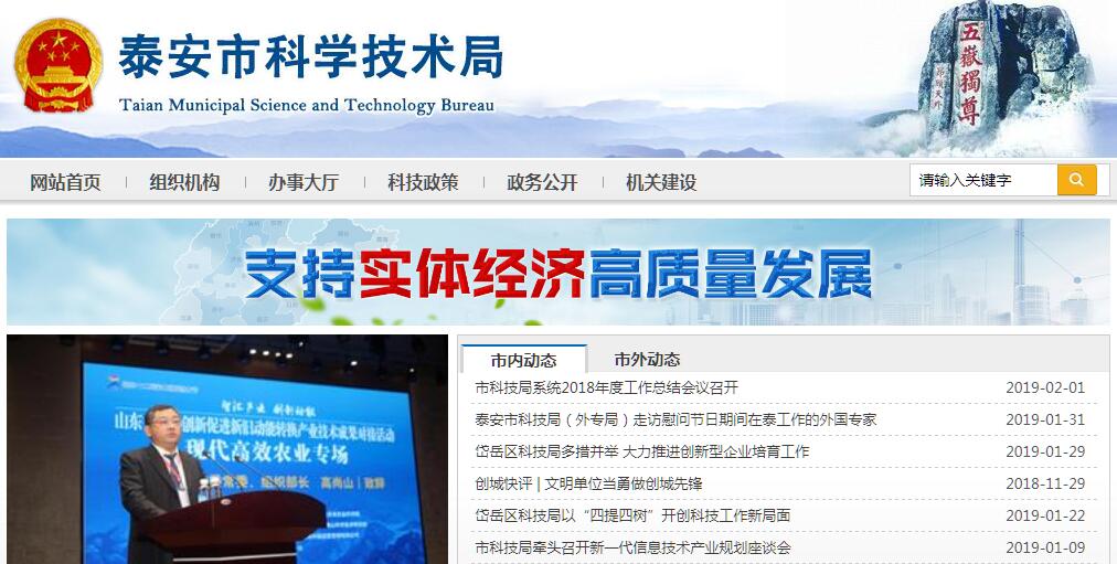泰安市科学技术局主要职责:一、贯彻执行国家、省有关科技工作的方针政策和法律法规,牵头拟订全市科技发展规划、政策并组织实施,起草有关地方规范性文件。二、编制并组织实施全市科学技术发展计划、农业良种产业化开发计划、农村科技信息服务专项计划、科技发明与创造引导计划、大学生科技创业助推计划等;制定政策引导类科技计划并指导实施。三、合理配置科技经费;负责归口管理的市级科学事业费、“应用技术研究与开发资金”等有关经费的预、决算。四、会同有关部门拟订高新技术产业化政策措施并组织实施,推动高新技术产业化相关技术服务体系建设;会同有关部门申报高新技术企业、技术创新型服务企业;会同有关部门组织申报科技型中小企业技术创新基金和高新技术风险投资基金;指导市高新技术产业开发区工作。五、组织拟订科技促进农村、社会发展规划,制定相关措施和办法,促进以改善民生为重点的新农村建设和社会建设;会同有关部门负责农业科技园区、可持续发展实验区和先进示范区的管理工作;承担市农业良种产业化开发项目管理办公室的日常工作;指导农业高新技术产业示范区工作。六、归口管理科技成果、科技奖励、科技保密、技术市场和科技信息市场;负责技术合同管理工作;负责社会力量设立的科学技术奖的登记管理工作;承担市科学技术奖励委员会的日常工作。七、制定科技成果推广政策,指导科技成果转化工作,组织相关重大科技成果应用示范;推动区域和产业技术创新战略联盟建设及企业自主创新能力建设。八、负责编制和实施市工程技术研究中心等科技基地计划;会同有关部门拟订重大创新基地建设规划;参与编制市重大科学工程建设规划;拟订全市基础研究、科技条件建设规划和政策;推进全市科技基础条件平台建设和科技资源共享。九、提出科技体制改革的政策和措施建议;推进科技创新体系建设;负责新建和调整科研机构的审核、申报工作。十、组织开展国内外科技合作与交流;承担市政府与国内高校、科研机构科技合作工作;会同有关部门组织技术出口和重大技术引进及引进技术的消化、吸收和再创新工作;归口管理全市科技外事工作。十一、拟订促进科技中介组织发展政策;组织制定科普规划和政策,统筹协调全市科普工作;负责软科学研究、科技宣传、科技信息、国防科技动员、科技应急管理工作;负责相关科技评估和科技统计管理工作。十二、会同有关部门拟订科技人才队伍建设规划,提出相关政策建议;指导全市科技培训工作。十三、牵头拟订促进与科技相关知识产权发展的规划和政策并组织实施,负责与科技相关的知识产权管理工作。十四、承办市委、市政府交办的其他事项。