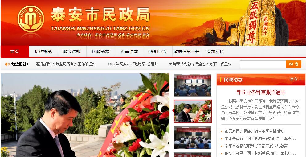 泰安市民政局主要职责:(一)拟订全市民政事业发展规划和相关政策并组织实施。(二)会同有关部门按规定拟订全市社会工作发展规划、政策,推进社会工作人才队伍建设和相关志愿者队伍建设。(三)管理国家、省和市拨民政事业经费,指导、监督民政事业经费的使用。(四)承担依法对社会团体、民办非企业单位进行登记管理和监察责任。(五)负责全市优抚对象的抚恤、补助、优待和国家机关工作人员伤亡抚恤工作;负责烈士褒扬工作;负责有关人员伤残等级的审核、报批、调整工作;指导优抚事业单位和烈士纪念建筑物的管理工作;组织指导全市拥军优属工作;承担市双拥工作领导小组的日常工作。(六)负责全市退役士兵、复员干部、移交地方政府安置的军队离退休干部和军队无军籍退休职工接收安置工作;指导全市军队离退休干部休养所(服务管理中心)建设和管理工作;指导军供站工作;指导全市退役士兵的技能培训工作;负责政府安置的军队离退休干部调整离退休费和护理费审批事项。(七)拟定全市救灾工作政策;组织、协调全市救灾工作;组织自然灾害救助应急体系建设;负责组织核查并统一发布灾情;管理、分配救灾款物并监督使用;组织、指导救灾捐赠,负责市直并指导县市区救灾物资储备工作;拟订全市减灾规划,承担市减灾委员会的日常工作。(八)牵头拟订全市社会救助规划、政策和标准,负责城乡居民最低生活保障、医疗救助、临时救助、生活无着人员救助工作;推进城乡社会救助体系建设。(九)拟订全市城乡基层群众自治组织建设和社区建设政策;指导城乡社区服务体系建设;提出加强和改进基层政权建设的建议;推动基层民主政治建设。(十)拟订全市行政区划总体规划并组织实施;负责县(市、区)、乡(镇、街道办事处)和行政村的设立、撤消、更名、区域界线变更和政府驻地迁移的审核、报批工作;负责市内县行政区域边界线的勘定和管理工作;承办市及县际行政区域边界争议的调查和调处工作;负责全市地名管理工作。(十一)拟订全市社会福利事业发展规划、政策;指导全市社会福利机构建设;指导、管理福利彩票发行工作;拟订促进慈善事业的政策;组织、指导社会捐助工作;指导老年人、孤儿和残疾人等特殊群体权益保障工作。(十二)推进婚俗和殡葬改革;指导全市婚姻登记工作;承办涉外、涉港澳台居民、华侨婚姻登记和涉港澳台居民和华侨儿童收养登记工作;负责全市经营性公墓的审报工作;指导全市婚姻、殡葬、收养、救助服务机构管理工作。(十三)指导全市移民安置管理工作。(十四)承办市委、市政府交办的其他事项。