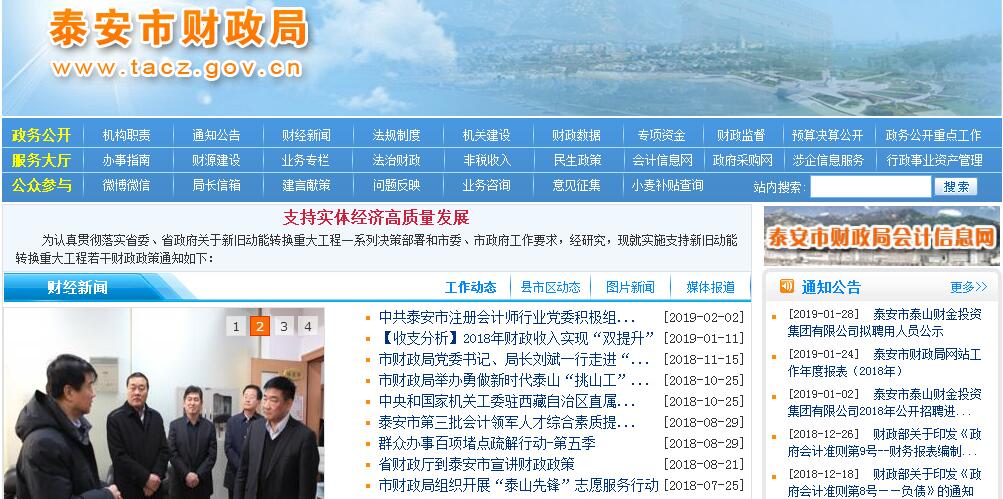 泰安市财政局主要职责:(一)贯彻执行国家和省财政、税收、相关国有资产管理的方针政策和法律法规,拟订全市财政、税收、相关国有资产管理的规范性文件和财务会计规章制度并组织实施。(二)根据国民经济和社会发展规划,拟订全市财政、税收、相关国有资产管理的中长期规划和改革方案;分析预测宏观经济形势,参与制定有关宏观经济政策;提出运用财税政策实施宏观调控和综合平衡社会财力的建议;拟订和执行市与县(市、区)及国家和企业的分配政策;完善鼓励公益事业发展的财税政策。(三)承担市级各项财政收支管理的责任。负责编制年度市级预算草案并组织执行,汇总全市财政预、决算;受市政府委托,向市人民代表大会报告市级和全市预算及其执行情况,向市人大常委会报告市级财政预、决算;组织制定市级经费开支标准、定额,负责审核批复部门(单位)的年度预决算;完善市以下转移支付制度。(四)负责全市税政管理工作,提出地方性税收政策建议。(五)负责政府非税收入管理,会同有关部门审批或申报行政事业性收费的立项;负责政府性基金、行政事业性收费征收管理;管理市级预算外资金和财政专户;管理财政票据;制定彩票管理政策和有关办法,管理彩票市场和彩票资金。(六)组织制定国库管理制度、国库集中收付制度,指导和监督市级国库业务,按规定开展国库现金管理工作;负责制定政府采购制度并监督管理。(七)负责制定全市行政事业单位国有资产管理规章制度,按规定负责行政事业单位国有资产管理工作;制定需要全市统一规定的开支标准和支出政策并组织实施。(八)负责审核和汇总编制全市国有资本经营预决算草案,制定国有资本经营预算的制度和办法;制定并组织实施企业财务管理制度,按规定承担地方金融类企业国有资产管理有关工作,参与拟订企业国有资产管理相关制度,按规定管理资产评估工作。(九)参与拟订市级建设投资的有关政策,制定和监督执行基本建设财务管理制度;制定政府投资和政府融资项目投资评审相关政策;负责政府投资和政府融资项目投资评审工作;负责对政府投资项目的财政性资金进行监督管理和跟踪问效;负责有关政策性补贴和专项储备资金财政管理工作。(十)会同有关部门管理市级财政社会保障和就业及医疗卫生支出,会同有关部门拟订社会保障资金(基金)的财务管理制度;编制市级社会保障预决算草案。(十一)拟订地方政府性债务管理的制度和办法;承担外国政府和国际金融组织贷款的管理工作;管理财政预算内行政机构、事业单位和社会团体的非贸易外汇。(十二)负责管理全市的会计工作,监督和规范会计行为;制定并组织实施会计制度;负责有关经济鉴证类社会中介机构及其执业人员的资质管理,指导和监督其业务活动;承担会计专业技术资格管理有关工作;指导和管理社会审计。(十三)参与拟订市级保障性住房的有关政策;会同有关部门管理市级财政住房保障支出,管理住房改革资金;负责对政府投资保障性住房的财政性资金进行监督管理和跟踪问效。(十四)负责全市农业综合开发管理工作。(十五)组织制定市级政府财政性融资方案,筹措、拨付财政性融资项目建设资金;对市级政府投融资分平台等使用政府财政性融资的单位实施业务指导和资金监督管理;指导县(市、区)做好政府投融资工作。(十六)指导和推动全市农村综合改革,承担市农村综合改革领导小组的日常工作。(十七)监督检查财税法规、政策的执行情况,检查反映财政收支管理中的重大问题,提出加强财政管理的政策建议。(十八)承办市委、市政府交办的其他事项。