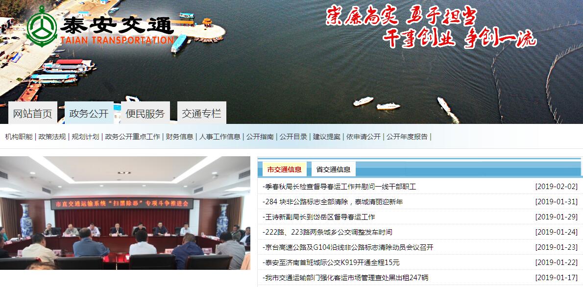 泰安市交通运输局主要职责:(一)贯彻执行交通运输工作法律、法规和方针、政策,起草有关地方性法规、规章草案;拟订全市公路、水路行业规划、计划、政策、标准并监督实施;参与拟订现代物流业发展规划、政策,拟订有关标准并监督实施;指导公路、水路行业有关体制改革工作。(二)承担涉及综合运输体系的规划协调工作,会同有关部门组织编制综合运输体系规划,指导交通运输枢纽规划和管理;负责相关行业统计,发布有关信息。(三)承担道路、水路运输市场监管责任;拟订道路、水路运输有关政策、准入制度、运营规范、技术标准并监督实施;按规定组织协调重点物资、紧急客货运输;指导道路、水路运输服务行业管理工作;会同有关部门负责治理公路、水路“三乱”工作;指导城市客运工作。(四)承担市管内河通航水域的水上交通安全监管责任;负责市管内河通航水域交通管制、危险品运输监管工作,组织市管内河通航水域救助打捞工作;负责船舶(不含渔业船舶)及相关水上设施检验、登记、防止污染工作;指导港口设施保安、引航管理工作;负责航道规划、建设、管理,船员发证以及港航设施建设和行业管理。(五)负责提出公路、水路固定资产投资规模和方向及政府财政性资金安排建议;执行公路、水路有关规费政策,提出有关财政、土地、价格等政策建议;负责公路通行费收费标准、公路超限检测站设置的审核报批工作;指导行业投融资工作。(六)承担公路、水路建设市场监管责任;拟订公路、水路工程建设相关政策、制度、技术标准并监督实施;组织协调公路、水路有关重点工程建设和工程质量、安全生产监督管理工作,指导公路、水路基础设施管理和维护工作;按规定负责港口规划和岸线使用管理工作。(七)负责提出高速公路及普通国道、省道的布局规划建议,协调高速公路有关工作,组织普通国道、省道公路及其附属设施的建设、养护和管理;监督和指导农村公路的规划、建设、养护、管理工作。(八)贯彻实施国家交通科技政策、技术标准和规范,组织行业科技开发,推动技术进步;指导公路、水路行业环境保护和节能减排工作;指导行业教育、培训工作。(九)指导交通运输方面的合作与交流工作;负责相关国际运输的管理工作。(十)指导公路、水路安全生产和应急管理工作;负责全市交通战备工作,推进交通领域军民融合,承办市国防动员委员会的有关工作。(十一)承办市委、市政府交办的其他事项。