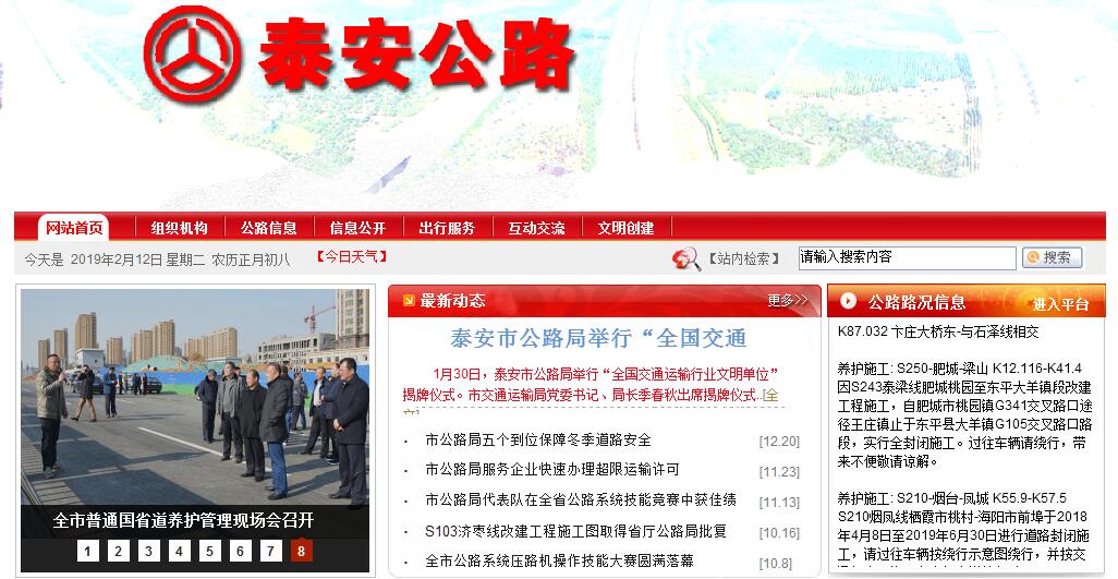| 网站简介: 泰安市公路局为具有行政职能的正县级事业单位,主要负责全市普通国省干线公路的规划、设计、建设、养护、路政管理(含部分高速公路的路政管理)、通行费征收等工作。市局机关内设职能科室14个、党群机构4个,下辖10个局直单位和5个县市区公路局。截至2014年底,全市公路通车里程达14446.9公里,公路密度达到每百平方公里186.1公里;其中国省干线公路通车里程达1189.4公里,我局负责管养3条国道、12条省道,管养里程822公里。泰城到各县市基本实现了高等级公路连接,形成了“1小时生活圈”。一个以泰城为中心,环城高速公路为枢纽,7条国道、15条省道为骨架,县乡公路和农村公路为依托,四通八达、干支相连的现代化公路网已经基本形成。近年来,市公路局坚持以科学发展观为指导,大力推进畅通公路、智能公路、绿色公路、平安公路、文化公路建设,强化管理,开拓进取,努力打造“和谐通道行稳致远”公路文化品牌,积极营造“畅安舒美”的公路通行环境,各项工作取得了显著成绩,为“推进富民强市,建设幸福泰安”做出了积极贡献。 |
