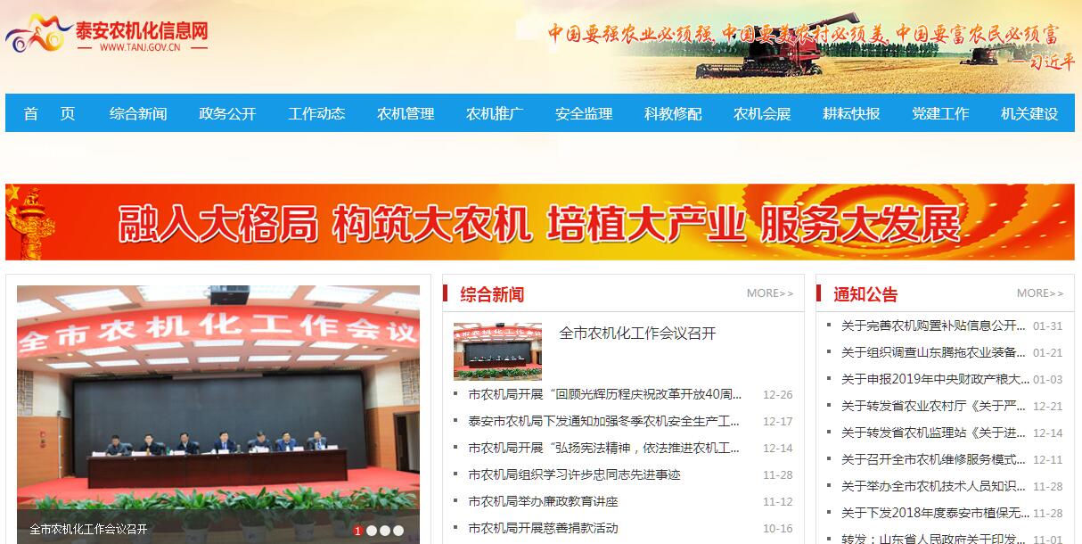 泰安市农业机械管理局是市政府主管全市农业机械化、设施农业工程、农用航空工作的职能部门。主要职责是:(一)贯彻执行国家、省关于农业机械化、设施农业工程、农用航空业务的方针、政策和法律、法规、研究拟订我市农机行业发展的具体政策措施和农机管理工作的规范性文件。(二)研究制订全市农业机械化、设施农业工程和农用航空业务的发展战略、中长期规划和年度计划并组织实施。(三)负责规划指导全市农机行业体制改革和农业机械化生产、农机工程开发和农业机械化服务体系建设,培育和发展农机服务市场,组织开展农机社会化服务。(四)负责全市农机行业的科研以及科研成果的鉴定、审核、申报工作,指导科技开发及新技术、新机具的试验、示范和推广工作。(五)负责农业机械的安全监理工作,指导全市农业机械操作人员的技术培训、安全教育和考核发证,参与农机事故的调查处理。(六)负责农业机械的适用性试验评估、委托性测试、试验鉴定、推广鉴定和推广许可证的发放管理;负责农业机械产品质量的监督管理。(七)指导全市农业机械销售和维修网点的规划建设工作,在有关部门的配合下,负责组织农机修理网点等级的审定、审验、发证工作,并对农机维修质量进行监督检查。(八)管理发展农业机械化事业的各项资金,负责全市农机行业统计,负责农业用油等物资的计划、农用救灾用油的分配和农机供油网点的管理。(九)管理直属事业单位,负责直属单位的领导班子建设和农机系统教育培训工作,都督管理直属单位的国有资产,指导所属企业体制改革和经营管理工作。(十)负责全市农机行业的对外交流与合作。(十一)承办市委、市政府交办的其他事项。