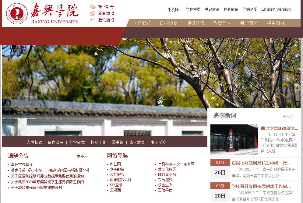 嘉兴学院是2000年3月经国家教育部批准,由原浙江经济高等专科学校和嘉兴高等专科学校合并组建的普通本科高校,实行“省市共建共管,以省为主”的管理体制。原浙江经济高等专科学校办学肇始于1914年,此后百年间数易校址,相继在宁波鄞县、杭州建德办学,先后隶属于国家重工业部、冶金部、中国有色金属工业总公司,被誉为中国有色行业培养经济管理人才的“摇篮”。嘉兴学院成立后,原平湖师范学校、嘉兴卫生学校、浙江会计学校和嘉兴市粮食干部学校四校相继并入。学校办学所在地——中国共产党诞生地嘉兴地处东南沿海、长三角中心腹地,东接上海、北邻苏州、西连杭州、南濒杭州湾,区域优势独特,产业发达、经济繁荣,是国家历史文化名城、江南文化发源地、世界互联网大会永久会址地、浙江省全面接轨上海示范区。学校现有越秀、梁林和平湖3个校区,校园面积1800亩,校舍建筑面积66万平方米。学校下设17个教学单位、2个直属科研机构,全日制在校本科生15000余人,成教在册生8000余人。教学科研仪器设备总值3.5亿元,图书馆纸质藏书195余万册、电子藏书175余万册。学校是全国绿化模范单位、浙江省平安校园、浙江省高校文明校园、浙江省节约型公共机构示范单位。嘉兴学院南湖学院是学校2003年经教育部批准设立的独立学院,现拥有全日制在校本科生近8000人。世界著名物理学家、香港科技大学原校长朱经武教授现为学校名誉校长。学校有教职工1800余人,高级职称教师570余人,博士学位教师480余人;双聘院士1人,国家“千人计划”专家1人,国家“百千万人才工程”入选人才1人,教育部“新世纪优秀人才支持计划”入选人才1人,省级有突出贡献中青年专家2人,省“钱江高级人才”特聘教授5人,省“千人计划”专家2人;省级重点创新团队2个,省级教学团队4个。学校设有55个本科专业,涵盖经济学、法学、教育学、文学、理学、工学、医学、管理学、艺术学9大学科门类,其中国家级特色专业2个,省级重点、优势(建设)、特色建设专业14个。建有国家级实验教学示范中心1个,省级实验教学示范中心6个。拥有省级一流学科6个,教育部人文社科重点研究基地1个,省级重点实验室1个,省级创新服务平台3个,省级工程技术研究中心1个,省级院士专家工作站1个,省哲学社会科学重点研究基地1个,省2011协同创新中心1个,省高校产学研联盟中心1个,嘉兴市重点实验室5个。《嘉兴学院学报》为全国高校社科期刊优秀学报,“嘉兴名人与嘉兴文化”栏目入选教育部“名栏工程”。学校面向全国30个省(市、自治区)招生,省内外录取分数线持续提高,毕业生初次就业率连续多年保持在96%左右;与美、英、澳、德、日、韩等10余个国家的20所高校开展联合培养研究生、派遣交换生等合作,每年接收长短期来华留学生约100人;与浙江师范大学等10余所国内高校合作联合培养研究生,每年在校培养研究生近100人。学校充分发挥与有色行业联系紧密优势,主动贴近地方企业产业发展需求,协同共建产教融合平台,深入推进“产学研相结合、教学做一体化”教育教学改革,2项校企合作育人成果获浙江省教学成果一等奖,5个校企合作项目被教育部认定为全国高校第一批产学研合作协同育人项目, 2014-2015学年、2015-2016学年连续在浙江省普通本科高校分类评价中位列教学为主型综合性高校第一位。学校充分发挥地处党的诞生地优势,以大力传承弘扬“红船精神”为己任,建有全国首个“红船精神研究中心”。嘉兴学院中国共产党革命精神与文化资源研究中心为教育部人文社科重点研究基地,浙江省中国共产党创建史研究中心为省哲学社会科学重点研究基地,浙江省红色文化研究与传承协同创新中心为省2011协同创新中心。学校是教育部思想政治理论课教师社会实践研修基地、浙江省高校党员干部教师革命传统教育培训基地、浙江省中国特色社会主义理论体系研究基地、浙江省重点马克思主义学院建设单位、浙江省高校二级党委领导下的院长负责制试点单位、浙江省高校文化校园建设首批试点单位。学校“红船先锋营”文化品牌获全国高校校园文化建设优秀成果一等奖,“省身文化”品牌获全国高校校园文化建设优秀成果奖。学校学子先后荣获团中央“中国青年志愿服务金质奖章”、全国“挑战杯”大学生创业计划竞赛金奖、2008-2010年连续三届“浙江骄傲”、浙江省十佳大学生、浙江省杰出志愿者、浙江省第一届感动校园人物、浙江省首届美德学子等荣誉。近年来,学校秉承“方正为人 勤慎治学”校训,弘扬“求是求真求正”校风,致力于培养具有创新精神、实践能力和社会责任感的高素质应用型、复合型人才,大力实施“重点突破、内涵提升、人才优先、协同创新”四大发展战略,不断提升应用研究能力、社会服务能力、文化传承与创新能力,正努力建设成为一所有特色、善创新、高水平的地方应用型大学。