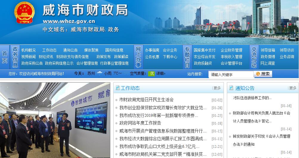 威海市财政局主要职责:(一)起草全市财政、税收、相关国有资产管理的规范性文件草案,拟订有关政策和财务会计制度并组织实施。(二)根据国民经济和社会发展规划,拟订全市财政、税收、相关国有资产管理的中长期规划及改革方案;分析预测宏观经济形势,参与拟订各项宏观经济政策;提出运用财税政策实施宏观调控和综合平衡社会财力的建议;拟订市与市区及国家与企业的分配政策;完善鼓励公益事业发展的财税政策。(三)承担市级各项财政收支管理的责任。负责编制年度市级预算草案并组织执行,汇总全市财政决算;受市政府委托,向市人民代表大会报告市级和全市预算及其执行情况,向市人大常委会报告决算;组织制定经费开支标准、定额,负责审核批复部门(单位)的年度预决算;组织对预算支出的绩效评价;完善转移支付制度。(四)负责全市税政管理工作,提出地方性税收政策建议。(五)负责政府非税收入管理,会同有关部门审批或申报行政事业性收费的立项;负责政府性基金、行政事业性收费征收管理;管理市级预算外资金和财政专户;管理财政票据;拟订彩票管理政策和有关办法,管理彩票市场和彩票资金。(六)组织制定国库管理制度和国库集中收付制度,指导和监督市级国库业务,按规定开展国库现金管理和国库集中支付工作;负责制定政府采购制度并监督管理。(七)负责制定全市行政事业单位国有资产管理制度,按规定负责行政事业单位国有资产及各类公有资产管理工作;负责市级与行政事业单位尚未脱钩的经济实体和事业单位转企改制工作中国有资产的监督管理;负责市政府投融资业务;负责管理市政府通过“招拍挂”方式取得的土地和其他存量土地;拟订需要全市统一规定的开支标准和支出政策并组织实施。(八)负责审核和汇总编制全市国有资本经营预决算草案,制定国有资本经营预算的制度和办法;制定并组织实施企业财务管理制度,按规定承担地方金融类企业国有资产管理有关工作。(九)参与拟订市级建设投资的有关政策,制定基本建设财务管理制度;参与市级政府投资项目的可行性论证,负责财政性投资和专项资金支出的必要性、可行性、合理性和绩效性评审;负责对政府投资项目的财政性资金进行监督管理和跟踪问效;审查建设项目的工程预算和竣工决算,参与制定工程取费标准;负责有关政策性补贴和专项储备资金财政管理工作。(十)会同有关部门管理市级财政社会保障和就业及医疗卫生支出,会同有关部门拟订社会保障资金(基金)的财务管理制度;编制市级社会保障预决算草案。(十一)拟订地方政府性债务管理的制度和办法,负责规范管理;承担外国政府和国际金融组织贷款的管理工作;开展财税领域的国际交流与合作。(十二)负责管理全市的会计工作,监督和规范会计行为,制定并组织实施会计制度;负责代理记账服务机构的资质管理,指导和监督其业务活动;承担会计专业技术资格管理有关工作。(十三)负责全市农业综合开发管理工作。(十四)指导和推动全市农村综合改革,承担市农村综合改革领导小组的日常工作。(十五)监督检查财税法规、政策的执行情况,检查反映财政收支管理中的重大问题,提出加强财政管理的政策建议。(十六)发挥职能作用和资源优势,为产业发展及招商引资(引智)促进提供高效便捷服务。(十七)承办市委、市政府交办的其他事项。