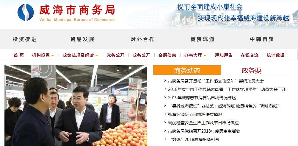 威海市商务局主要职责:(一)起草商务领域的规范性文件草案,拟订全市商务领域发展规划、政策并组织实施;研究对外贸易、外商投资、商贸流通、经济合作的发展趋势并提出改革与发展建议。(二)负责推进全市商贸流通行业的营销改革和结构调整,提出促进商贸流通企业发展的政策建议;推动流通标准化和连锁经营、特许经营、物流配送等现代流通方式的发展;指导商品市场的标准化建设,促进商业业态和流通组织的创新。(三)负责推进城乡商贸流通统筹发展,培育发展和完善市场体系。会同有关部门组织编制中、长期商业网点发展总体规划,拟订城市商业网点发展政策;指导市、区商业中心和特色商业街建设;指导餐饮服务业的发展;推进家政服务工程,规划和培育社区商业服务体系;组织实施农村现代流通网络工程,推进农村市场体系建设。(四)拟订开拓市场、促进消费的政策措施;会同有关部门安排和监督商贸流通行业专项资金使用;指导流通领域政府财政性安排的投资项目建设,对资金使用及项目落实情况进行监督检查。(五)牵头协调整顿和规范市场经济秩序工作,拟订规范市场运行、流通秩序的政策;推动商务领域信用建设,指导商业信用销售;指导监督商贸流通行业的经营活动;负责商贸流通特殊行业的行政执法工作;按规定对拍卖、典当、租赁、酒类流通、二手车流通、报废汽车回收(含拆解)、再生资源回收等特殊流通行业进行监督管理;拟订流通领域“菜篮子”商品食品安全的政策措施并组织实施;会同有关部门对商业特许经营、直销实施监督管理。(六)负责生活必需品市场供应应急管理体系建设;监测分析市场运行、商品供求状况,进行预测预警和信息引导,提出市场运行及调控政策建议;按规定负责重要消费品储备管理、市场调控和重要生产资料流通管理工作。(七)拟订促进外贸发展方式转变的政策并组织实施;按规定负责重要工业品、原材料和重要农产品(粮食、棉花除外)进出口计划及配额的初审和监督管理;指导监督贸易促进活动和外贸促进体系建设。(八)拟订机电产品进出口发展规划、政策并组织实施;依据国家产业政策、结合我市产业实际调整机电产品进出口结构;负责机电产品进出口申报、审核和管理工作,指导协调大型成套设备出口,组织企业开拓机电产品国际市场;监督、协调全市机电产品国际招标投标工作。(九)拟订技术贸易发展规划、政策并组织实施;组织实施“科技兴贸”战略相关工作,承担高新技术产品贸易促进工作;指导管理加工贸易,按规定核准加工贸易业务;按规定负责两用物项、易制毒化学品进出口管理和最终用户管理工作;推进进出口贸易标准化工作。(十)牵头拟订服务贸易发展规划并开展相关工作,制定促进服务外包发展政策并组织实施,推动服务外包平台建设。牵头拟订电子商务发展规划并开展相关工作,促进电子商务应用。(十一)会同有关部门拟订我国加入世贸组织后地方综合应对方案并组织实施;承担世界贸易组织相关规则、协议的咨询服务工作;组织协调涉及我市的反倾销、反补贴和保障措施及其他相关工作;指导、协调企业对进口产品发起的反倾销、反补贴和保障措施调查;建立市内进出口公平贸易预警机制;协助省商务厅组织开展对外贸易壁垒调查和产业损害调查;指导、协调产业安全应对工作;按规定承担对经营者集中行为进行反垄断调查的相关工作。(十二)指导、管理全市外商投资工作;拟订全市吸引外商投资发展规划和政策;按权限核准和审核外商投资企业的设立及变更事项;依法监督检查外商投资企业执行有关法律法规规章、合同章程的情况并协调解决有关问题。(十三)组织、协调、指导全市招商引资促进工作。负责研究国内外招商引资政策和发展趋势,提出相关对策和建议;拟订全市招商引资政策、规划和年度计划;会同各区市和相关部门开展全市招商引资环境营销策划,推介全市重点领域、重点产业和重大招商引资项目;拟订全市重大招商引资活动并牵头组织实施;指导和参与重大招商引资项目洽谈、协调和督办工作;负责本行业及相关产业发展研究和招商引资(引智)促进工作。(十四)拟订全市“走出去”发展规划、政策并组织实施;研究拟订境外投资的管理办法和具体政策;依法初审、上报、管理市内企业对外投资开办企业机构(金融企业除外)。(十五)负责对外经济合作和对外援助工作;管理、监督对外承包工程、对外劳务合作等对外经济合作业务;审核上报对外承包工程经营资格;审核上报对外劳务合作经营资格;按规定负责外派劳务和境外就业人员的权益保护工作;依法管理我市承办的国家对外援助项目,管理多双边及国外民间组织对我市提供的无偿援助和赠款项目(不含财政合作项下外国政府及国际金融组织对我市赠款)。(十六)会同有关部门拟订全市经济开发区、园区、海关特殊监管区域发展规划、政策;协助省商务厅负责省级经济开发区、园区商务工作的综合协调和产业发展政策的组织实施;负责经济开发区、园区商务工作的综合评价、统计上报、考核工作。(十七)负责发展我市与有关国际经济组织、国外地方政府、友好城市间的经贸关系,建立联系机制并组织开展相关工作;推进与香港、澳门特别行政区和台湾地区的经贸合作。(十八)审批、管理外国及香港、澳门特别行政
