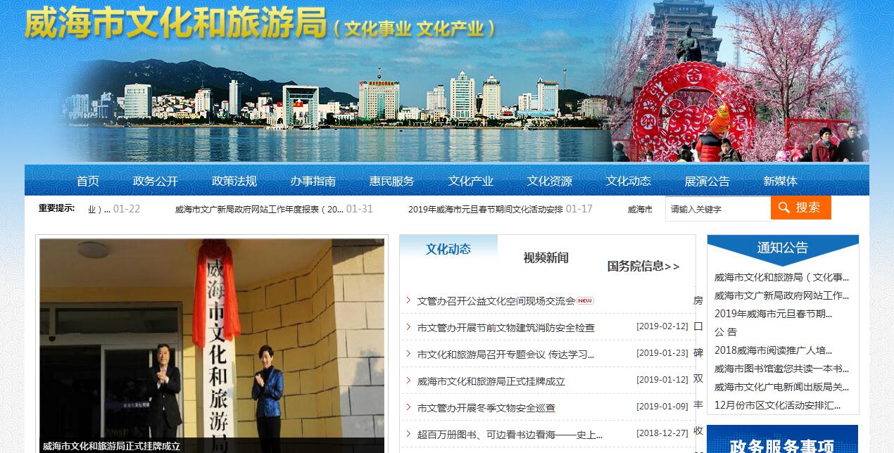 2019年1月3日,威海市文化和旅游局举行挂牌仪式,市委常委、宣传部长刘广华,副市长杨丽出席仪式并揭牌。刘广华致辞。刘广华指出,新组建市文化和旅游局,是市委、市政府贯彻落实中央和省委深化机构改革决策部署的重要举措,体现了市委、市政府对文化旅游事业的高度重视,标志着全市文化旅游工作迈入崭新的融合发展阶段。要以此为契机,进一步提高政治站位,理清发展思路,创新发展方式,着力展现出文化旅游发展新气象、新担当、新作为。要适应职能转变,充分调动干部队伍的积极性、主动性和创造性,整合资源优势,协调理顺各项工作,统筹推进,精准发力,不断提高文化和旅游的高质量发展水平。要积极推进文化与旅游的深度融合、创新突破,推出更多有内涵、有品位的文化旅游产品,为加快推进“精致城市•幸福威海” 建设作出更大贡献。新组建的市文化和旅游局,整合了市文化广电新闻出版局、市旅游发展委员会的职责,以及市文物管理办公室承担的行政职能,作为市政府工作部门,正处级规格,加挂市新闻出版广电局、市文物局牌子,归口市委宣传部领导。市文化和旅游局主要负责管理文化、新闻出版、广播电视、文物、旅游等行政事务;统筹规划文化事业、文化产业、旅游业和文物保护事业发展;维护各类文化和旅游市场秩序等。