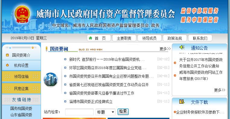 威海市人民政府国有资产监督管理委员会主要职责:(一)根据市政府授权,依照《中华人民共和国公司法》、《企业国有资产监督管理暂行条例》等法律、法规,履行出资人职责,监管市属企业的国有资产,加强国有资产的管理工作。(二)承担监督所监管企业国有资产保值增值的责任;建立和完善国有资产保值增值指标体系,拟订考核标准;通过统计、稽核等方式对所监管企业国有资产的保值增值情况进行监管,依法维护国有资产出资人的权益。(三)指导推进国有企业改革和重组,推进国有企业现代企业制度建设,完善公司治理结构,推动全市国有经济布局和结构的战略性调整。(四)通过法定程序对所监管企业负责人进行任免、考核,并根据其经营业绩进行奖惩,建立符合现代企业制度要求的选人、用人机制,完善经营者激励和约束制度;负责所监管企业工资分配管理工作,制定所监管企业负责人收入分配政策并组织实施。(五)指导所监管企业董事会、监事会建设,负责外派董事、监事的日常管理工作。(六)负责组织所监管企业上交国有资本收益;参与制定国有资本经营预算有关管理制度和办法;按照有关规定负责所监管企业国有资本经营预决算编制和执行等工作。(七)按照出资人职责,负责督促检查所监管企业贯彻落实国家安全生产方针政策及有关法律、法规等工作。(八)负责企业国有资产基础管理;负责国有资产产权界定、登记、划转、处置及产权纠纷调处等工作;起草企业国有资产监督管理的规范性文件草案;依法监督管理市属企业的国有资产,查处和制止国有资产流失、损失行为,对有关责任人提出处理意见和建议;依法对各市区国有资产管理工作进行指导。(九)承办市委、市政府交办的其他事项。