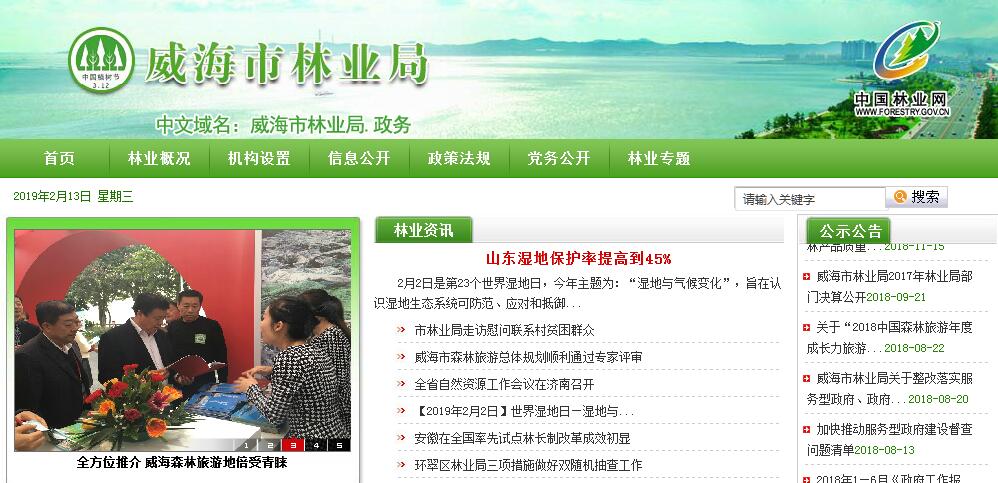 根据《中共威海市委、威海市人民政府关于威海市人民政府职能转变和机构改革的实施意见》(威发〔2014〕15 号),设立威海市林业局,为市政府工作部门。其主要职责:(一)贯彻执行林业工作法律、法规和方针、政策;起草有关规范性文件草案;拟订相关发展规划和年度生产指导性计划并组织实施;负责全市林业及其生态建设的监督管理工作;承担林业生态文明建设有关工作;组织开展森林资源、陆生野生动植物资源和湿地的调查、动态监测、评估,并统一发布相关信息;监督、指导全市林业系统环境保护工作。(二)组织、协调、指导和监督全市造林绿化工作;制定全市造林绿化的指导性计划,监督执行相关标准、规程;负责造林、营林质量监督管理工作;指导各类公益林和商品林的培育发展工作;指导植树造林、封山育林和以植树种草等生物措施防治水土流失工作;承担林业应对气候变化的相关工作;组织、指导和监督退耕还林工作;指导森林城市建设工作;承担市绿化委员会的日常工作。(三)承担全市森林资源保护发展监督管理的责任;编制全市森林采伐限额,监督检查林木凭证采伐、运输;拟订林地保护利用规划并指导实施,审核、报批林地的征用、占用。(四)负责全市林业系统自然保护区的监督管理工作;指导全市森林、陆生野生动物类型自然保护区的建设与管理;拟订湿地保护规划,指导、监督湿地的保护和合理利用;组织、协调有关国际湿地公约在我市的履约工作。(五)组织、指导陆生野生动植物资源的保护和合理开发利用;提出全市国家重点保护的陆生野生动物、植物名录调整建议;组织、指导陆生野生动植物的救护繁育、栖息地恢复发展、疫源疫病监测等工作;监督管理全市陆生野生动植物猎捕、采集、驯养繁殖和培植、经营利用;承担濒危物种进出口和国家、省保护的野生动物、珍稀树种、珍稀野生植物及其产品出口的审核、申报工作。(六)负责国有林场、苗圃和森林公园的监督管理工作;指导全市森林旅游工作;指导林木种苗质量监督管理,审定林木良种;负责林业生物种质资源、转基因生物安全、植物新品种、古树名木、珍贵树木和林业方面生物多样性保护的有关工作。(七)承担推进全市林业改革和维护农民经营林业合法权益的责任;拟订集体林权制度、国有林场等重大林业改革意见并组织实施;指导、监督农村林地承包经营和林权流转,指导林权纠纷调处和林地承包合同纠纷仲裁。(八)承担组织、协调、指导和监督全市森林防火工作的责任;组织、协调、指导森林消防专业队伍建设工作;指导全市森林公安和林业有害生物的防治、检疫工作,指导林业重大案件的查处;承担市森林防火与林业有害生物防控指挥部的日常工作。(九)负责指导林业生态补偿制度的建立和实施;负责管理市级林业资金并监督国家、省和全市林业资金的使用;管理市级国有林业资产;审核重点林业建设项目;提出林业固定资产投资规模、方向和市级财政性资金安排建议;负责全市林业统计工作。(十)组织、指导全市林业信息化建设工作。(十一)组织、指导林业系统人才、科技、教育培训、产业发展、外事和引用外资工作。(十二)负责林业行业安全生产监督管理;指导、监督职责范围内林区、林场、森林公园、湿地公园等重点单位和其他涉林生产经营单位的安全生产工作;指导、监督林产品加工生产经营单位的安全生产工作。(十三)负责本行业本领域及相关产业发展研究和招商引资(引智)促进工作。参与相关产业发展规划编制和政策制定,组织策划、论证产业发展项目,制定年度招商引资(引智)计划;组织宣传推介相关产业政策和地方投资环境;牵头组织产业对接活动,参与具体产业项目的策划、联络、跟踪与服务。(十四)承办市委、市政府交办的其他事项。