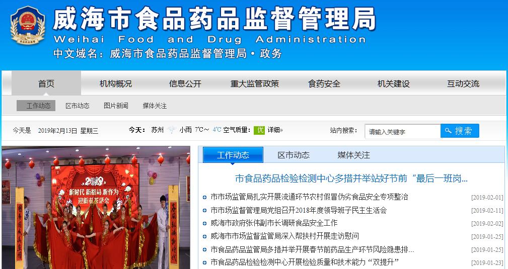 威海市食品药品监督管理局主要职责:(一)负责实施国家、省、市食品(含食品添加剂、保健食品、酒类,下同)安全、药品(含中药、民族药,下同)、医疗器械、化妆品监督管理法律、法规、规章和相关规划、政策,组织拟订相关规范性文件并监督实施;推动建立落实食品药品安全企业主体责任、政府负总责的机制,组织实施食品药品重大信息直报制度;防范区域性、系统性食品药品安全风险。(二)负责实施和监督食品行政许可;建立食品安全隐患排查治理机制,制定全市食品安全检查年度计划、重大整顿治理方案并组织落实;组织实施全市食品安全信息统一公布制度,公布市内食品安全日常监督管理信息;组织开展食品安全监督抽样检查工作;负责保健食品广告审查。(三)负责实施和监督药品、医疗器械、医疗机构制剂行政许可;监督实施国家药典等药品和医疗器械标准及分类管理制度;监督实施药品和医疗器械研制、生产、经营、使用质量管理规范;组织开展药品监督抽样检验工作;建立药品和化妆品不良反应、医疗器械不良事件监测体系并开展监测和处置工作;配合实施国家基本药物制度;监督实施中药饮片炮制规范;组织实施国家化妆品监督管理办法;组织实施执业药师制度。(四)负责制定全市食品、药品、医疗器械、化妆品监督管理的稽查制度并组织实施,组织查处重大违法行为;规范行政执法行为,完善行政执法与刑事司法衔接机制;监督实施问题产品召回和处置制度。(五)负责食品药品安全事故应急体系建设,组织和指导重大食品药品安全事故应急处置和调查处理工作,监督事故查处落实情况。(六)负责制定全市食品药品安全科技发展的政策措施并组织实施,推动食品药品检验检测体系、电子监管追溯体系和信息化建设。(七)负责开展食品药品安全宣传、教育培训;推进诚信体系建设。(八)掌握分析全市食品、药品、医疗器械、化妆品安全形势和存在问题,提出完善制度机制和改进工作的建议;指导市(区)、市属开发区食品药品监督管理工作。(九)承担市食品安全委员会日常工作;负责食品安全监督管理综合协调,健全协调联动机制;督促检查食品安全法律法规和市食品安全委员会决策部署的贯彻落实情况;督促检查市(区)政府、市属开发区管委履行食品安全监督管理职责情况并负责考核评价。(十)承办市委、市政府以及市食品安全委员会交办的其他事项。