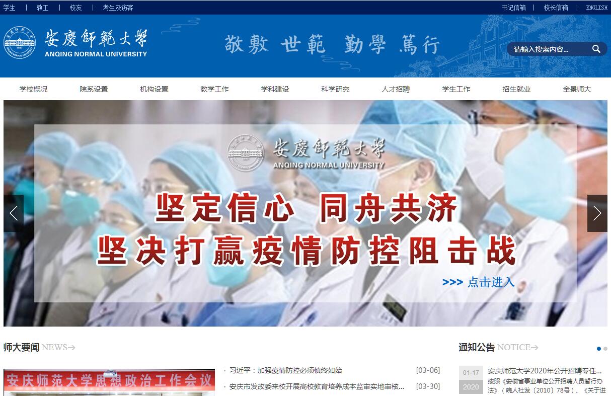 安庆师范大学坐落在国家历史文化名城、国家园林城市、中国优秀旅游城市——安庆。这里是桐城派的故里、黄梅戏的故乡,有着“千年古城、文化之邦、百年省会、戏剧之乡”的美誉。学校傍依浩瀚长江,毗邻宁安高铁、合安九高铁,地理位置优越,水、陆、空交通便利,是皖西南地区唯一的省属师范大学。学校办学历史悠久,是安徽近代高等教育的发源地。1897年,清代著名省学敬敷书院在此办学,揭开了百年育人的序幕。1901年,敬敷书院与求是学堂合并成立安徽大学堂,后更名为安徽高等学堂。1928年省立安徽大学在此创办,1946年改为国立安徽大学。菱湖校区现存的敬敷书院和国立安徽大学红楼,作为全国重点文物保护单位见证了学校百年发展历程。1980年,经国务院批准成立安庆师范学院。2006年,学校获批硕士学位授予权。2007年获得教育部本科教学工作水平评估“优秀”等次。2016年,经教育部批准更名为安庆师范大学。2017年,安庆师范大学进入安徽省一本招生行列。学校办学条件优越,现有龙山、菱湖两个校区,占地面积 2845 亩。设有17个二级学院,80个本科专业,涵盖文学、经济学、历史学、法学、教育学、理学、工学、管理学、农学、艺术学等10大学科门类,以人文学科、社会学科、理学、工学为主要学科门类。现有教职工1200余人,其中副高以上专业技术职称500余人,博士、硕士学位的教师占专任教师总数的90%以上。拥有国家级教学名师、省级教学名师、享受国务院和省政府特贴专家、省学术技术带头人及后备人选等各类优秀人才110余人。全日制在校生18000余人。学校教学水平优秀,不断深化教育教学改革,大力推进教学质量工程建设。近年来,获得国家级特色专业、国家级教学团队、国家级人才培养模式创新试验区、国家大学生文化素质教育基地、国家级大学生校外实践教育基地、国家级精品课程、国家大学生素质教育精品通识课程、国家精品视频公开课等国家级质量工程建设项目14项,承担省级重点教研项目、省级教研项目160余项,获得省级教学成果特等奖、一等奖30余项。学校学科实力较强,拥有5个省级重点学科,11个一级学科学术硕士学位点(马克思主义理论、中国语言文学、数学、化学、统计学、教育学、中国史、生态学、信息与通信工程、环境科学与工程、软件工程),7个专业硕士学位授权类别(教育、化学工程、法律、体育、翻译、新闻与传播、艺术)。建有中央与地方共建高校特色实验室、共建国家认可实验室、省重点实验室、省人文社科重点研究基地、省协同创新中心、省工程技术研究中心等17个省部级平台。近五年来,主持国家自然科学基金、国家社会科学基金以及省部级项目300余项,获得省部级以上科研奖励25项。学校开放办学活跃,与美国索尔兹伯里大学、德国希尔德斯海姆大学、韩国韩瑞大学等16所国外高校结成友好合作学校,开展联合培养商务英语专业“3+1”和国际经济与贸易专业“2+2”双学位项目,在教师交流、学生互派、教学科研等方面开展实质性合作。学校还与国内一批著名高校、科研院所、大型国有企业开展合作研究。学校办学特色鲜明,在长期办学实践中形成了“文化育人、服务立校”的办学特色。以社会主义核心价值观为引领,围绕优秀地方文化传承创新,依托丰厚的地方文化资源和独特的区位优势,在桐城派与桐城文化、黄梅戏传承创新、教师教育、石油化工新材料等地方主导产业、皖西南生物多样性研究与保护等方面取得突出成绩。学校育人成果丰硕,始终紧扣立德树人根本任务,大力弘扬“敬敷、世范、勤学、笃行”校训精神,深入实施修德、修智、修行“三修”教育工程,促进学生成长、成人、成才、成功。改革开放以来,累计为国家培养全日制高等专门人才10余万名,为国家经济社会发展作出了重要贡献。五年来,学生在“挑战杯”课外学术科技作品竞赛、全国师范生教学技能大赛、全国计算机仿真大赛、全国大学生数学建模大赛、全国大学生物流设计大赛等各类大型比赛中获得国家级奖励1100余项。本科毕业生就业率和考研录取率在全省本科院校中名列前茅。学校事业全面发展,是全国学校艺术教育工作先进单位,连续十五年全国大中专学生青年志愿者暑期“三下乡”社会实践活动先进单位,连续六届安徽省文明单位,连续七年安徽省普通高校毕业生就业工作先进集体,连续四年安徽省就业工作标兵单位,先后多次被授予安徽省党建和思想政治工作先进高校等称号。新时代新起点新征程,学校将牢牢把握社会主义办学方向,全面贯彻党的十九大精神和安徽省第十次党代会精神,落实学校第一次党代会决策部署,紧扣立德树人根本任务,抢抓“双一流”建设机遇,强化服务地方使命担当,努力建设特色鲜明的地方应用型高水平大学。