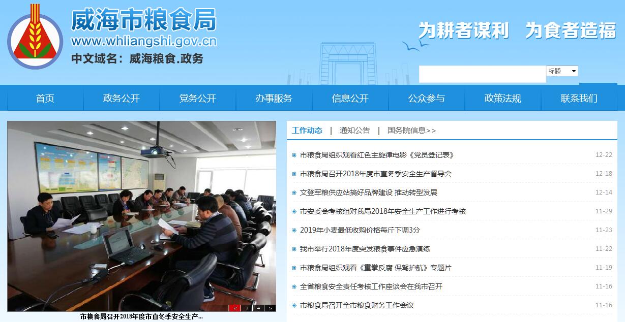 威海市粮食局主要职责:(一)提出全市粮食宏观调控、总量平衡及粮食流通的中长期规划、收支存计划和市级储备粮的收储、动用建议并组织实施;提出全市粮食流通产业发展的建议,推动国有粮食企业改革。(二)承担粮食监测预警和应急责任,负责全市粮食流通宏观调控的具体工作;指导粮食购销有关工作,保障驻军和城乡居民的粮食供应。(三)拟订全市粮食流通和储备等方面的意见并组织实施,起草相关规范性文件草案。(四)负责对全市粮食收购、储存环节及政策性用粮购销活动中的粮食质量安全和原粮卫生进行监督管理。(五)承担市级储备粮行政管理责任,提出市级储备粮的规模、总体布局和收购、销售、储存、轮换计划并组织实施;负责市级储备粮库资产管理和全市粮食清仓查库工作;指导全市粮食储备体系建设。(六)编制全市粮食流通、仓储、加工设施建设规划,提出有关粮食流通设施市级投资项目的建议,参与有关粮食流通设施市级投资项目的建设管理。(七)拟订全市粮食市场体系建设与发展规划并组织实施,指导全市粮食市场建设与管理,协同有关部门共同管好粮食市场,维护正常的粮食流通秩序。(八)负责全市粮食统计、流通信息工作;指导、监督全市粮食系统财务工作。(九)承办市委、市政府交办的其他事项。