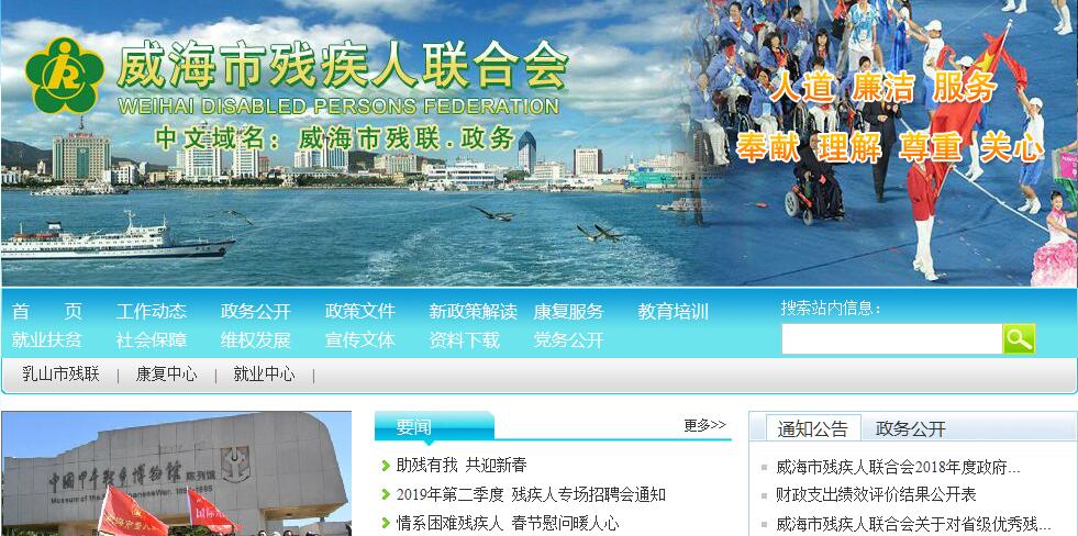 威海市残疾人联合会,是中国残疾人联合会的地方组织,是市委、市政府直接管理的具有“代表、管理、服务”职能的全市残疾人组织,其主要职责是:(一)贯彻执行党和国家关于残疾人事业方面的方针、政策、法律、法规,协助市政府研究起草本市残疾人事业方面有关政策和规章草案,参与市政府制定全市残疾人事业发展五年规划和年度计划。审批残疾人证件,管理盲人按摩业务。接受市政府委托,实施行政执法,安排残疾人就业和收缴残疾人就业保障金。(二)执行《残疾人保障法》,听取残疾人意见,反映残疾人需求,维护残疾人合法权益,为残疾人服务。(三)团结、教育残疾人,遵守法律、法规,履行应尽义务,发扬乐观进取精神,自尊、自信、自强、自立,为建设全面小康社会贡献力量。(四)弘扬人道主义,组织社会募捐,发展残疾人事业,沟通党和政府、社会与残疾人之间的联系,动员社会理解、尊重、关心、帮助残疾人。(五)协调有关部门开展残疾人康复、教育、劳动就业、扶贫、文化、体育、科研、维权、辅助器具供应、福利、社会服务、无障碍设施建设和残疾预防等工作,创造良好的环境和条件,扶助残疾人平等参与社会生活。(六)接受上级残疾人联合会的业务工作指导。同时,对下级残疾人联合会有关业务工作进行指导和评价。(七)承担市残疾人工作协调委员会的日常工作,做好综合、组织、协调和服务任务。(八)指导各类残疾人社团组织开展有关活动。(九)开展残疾人事业的国际交流与合作。(十)完成市委和市政府交办的其他工作。