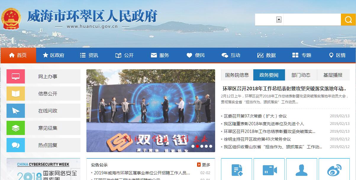 | 网站简介: 环翠区,隶属于山东省威海市,是威海市政府驻地、威海市的中心城区,是威海市政治、经济、文化、科技中心。环翠区地处山东半岛最东端,三面环海,东与朝鲜半岛、日本列岛隔海相望,是中国与韩国直线距离最近的城市。截至2016年,环翠区下辖5街、3镇,户籍总人口30.87万人。实现生产总值329.49亿元,其中,第一产业增加值24.10亿元,第二产业增加值127.17亿元,第三产业增加值178.22亿元。三次产业增加值占生产总值的比重分别为7.31%、38.6%和54.09%。环翠区是中国第一个 “国家卫生城”、第一个 “国家环境保护模范城市群”、第一个“国家优秀旅游城市群”。两次被联合国评为“全球改善人类居住最佳范例城市”,2003年获得联合国“人居奖”, 2005年被评为欧洲游客最喜爱的中国旅游目的地,2006年,环翠区所辖6个乡镇全部被评为“国家级环境优美乡镇”。2018年10月,入选2018年度全国新型城镇化质量百强区、全国绿色发展百强区。 |